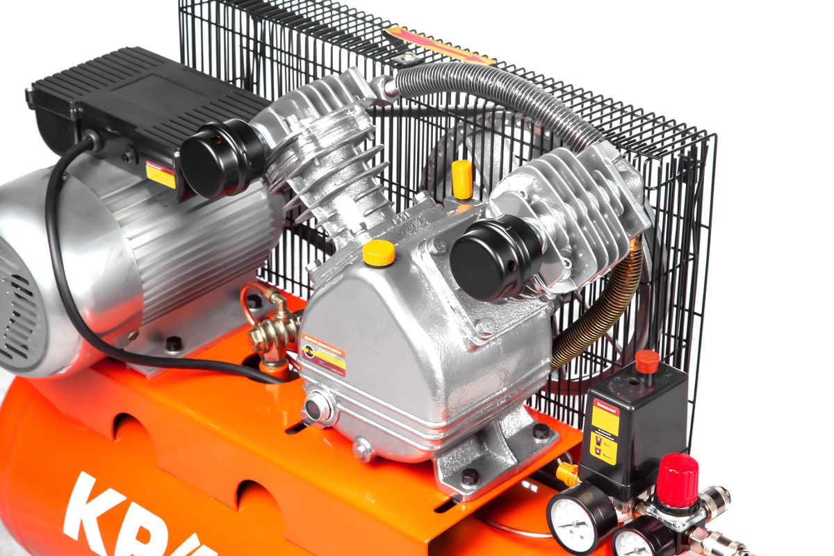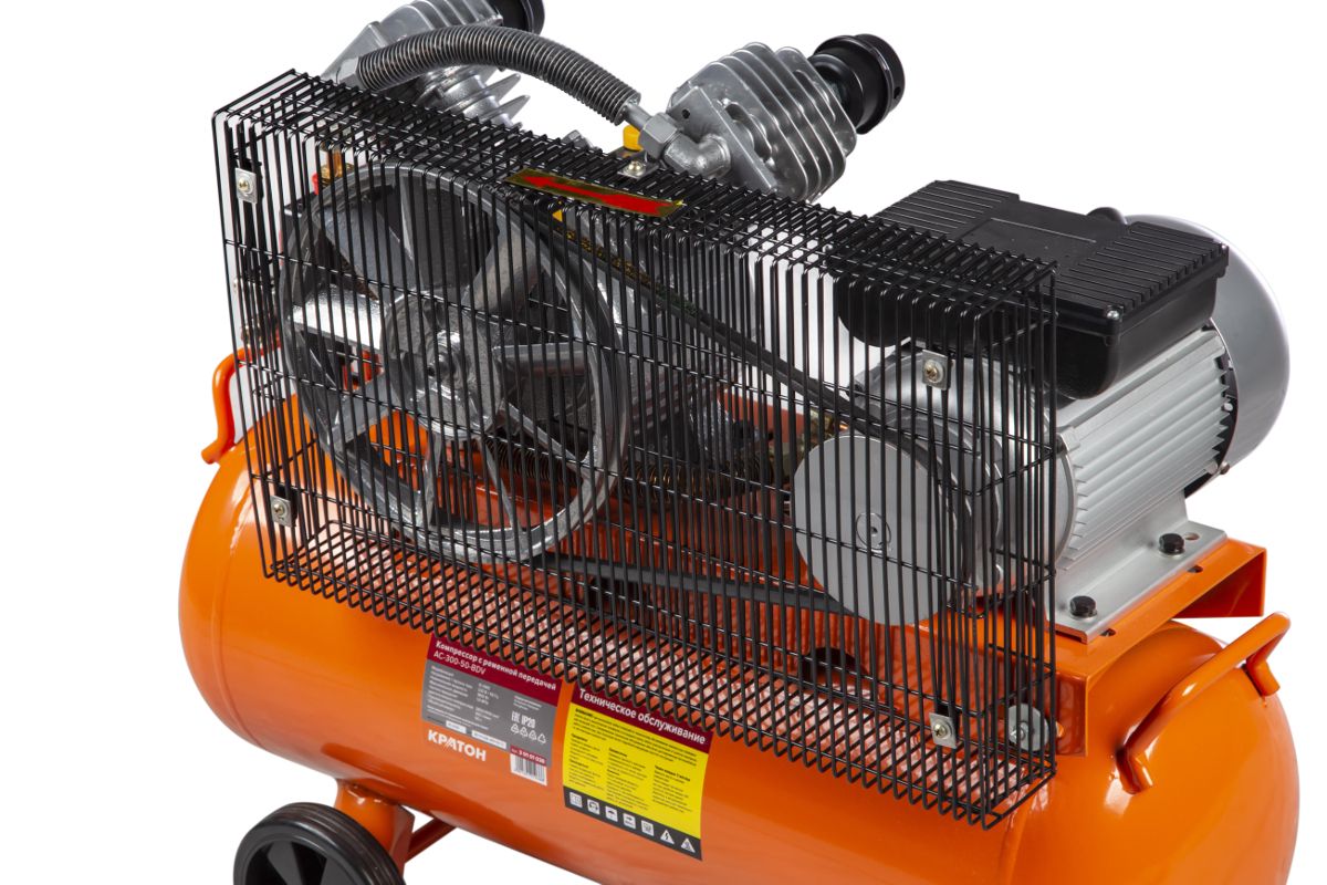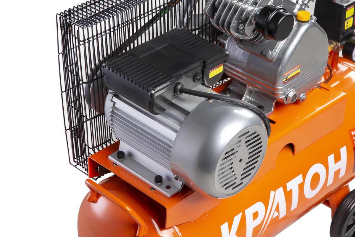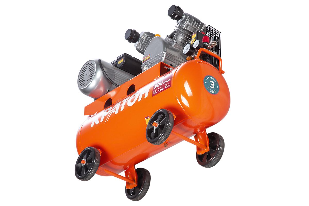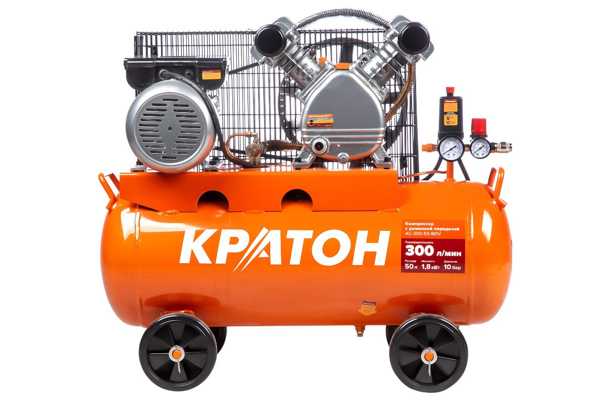 Компрессор ременного привода КРАТОН AC-300-50-BDV при двигателе в 1500 Вт перегоняет до 300 л/мин. Совместим с большинством пневмоинструментов.