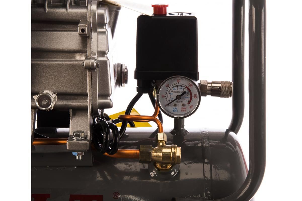 Компрессор с электрическим типом двигателя. Подходит для использования в быту, а также в автосервисах, гаражах, мастерских. Агрегат применяется для нагнетания воздуха для подкачки шин, распыления краски и работы с пневмоинструментами. Эта модель имеет колёса и рукоятку для удобства перемещения. Компрессор отличается ударопрочным и износостойким корпусом, надёжностью и долговечностью.