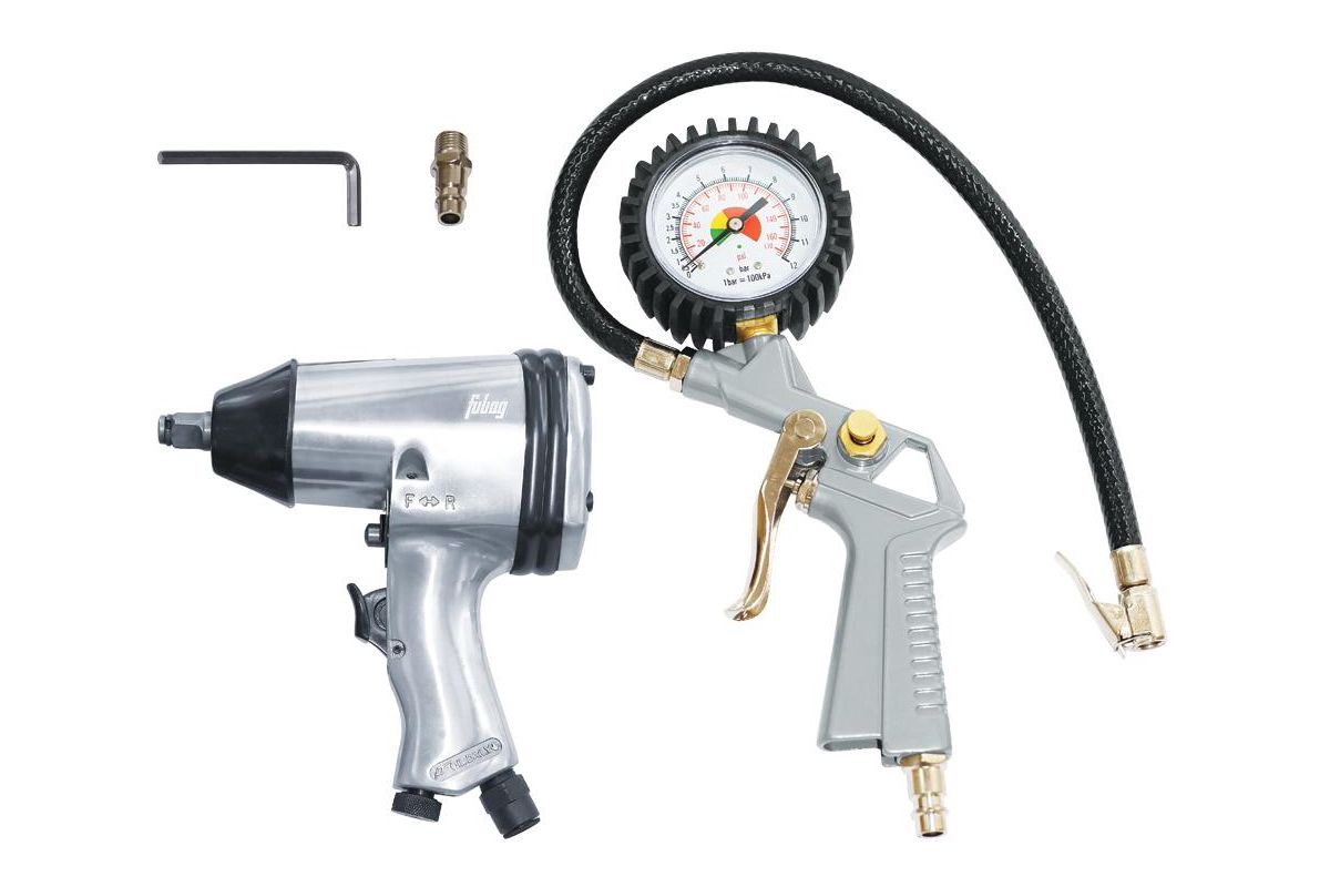 В состав набора входят: Компрессор FUBAG VDС 400/100 CM3 поршневой масляный, 2200 Вт, 360л/мин, 8бар, Набор пневмогайковерт FUBAG GP158/312 158л/мин 312н/м 7000об/мин пневмопистолет д/шин манометр