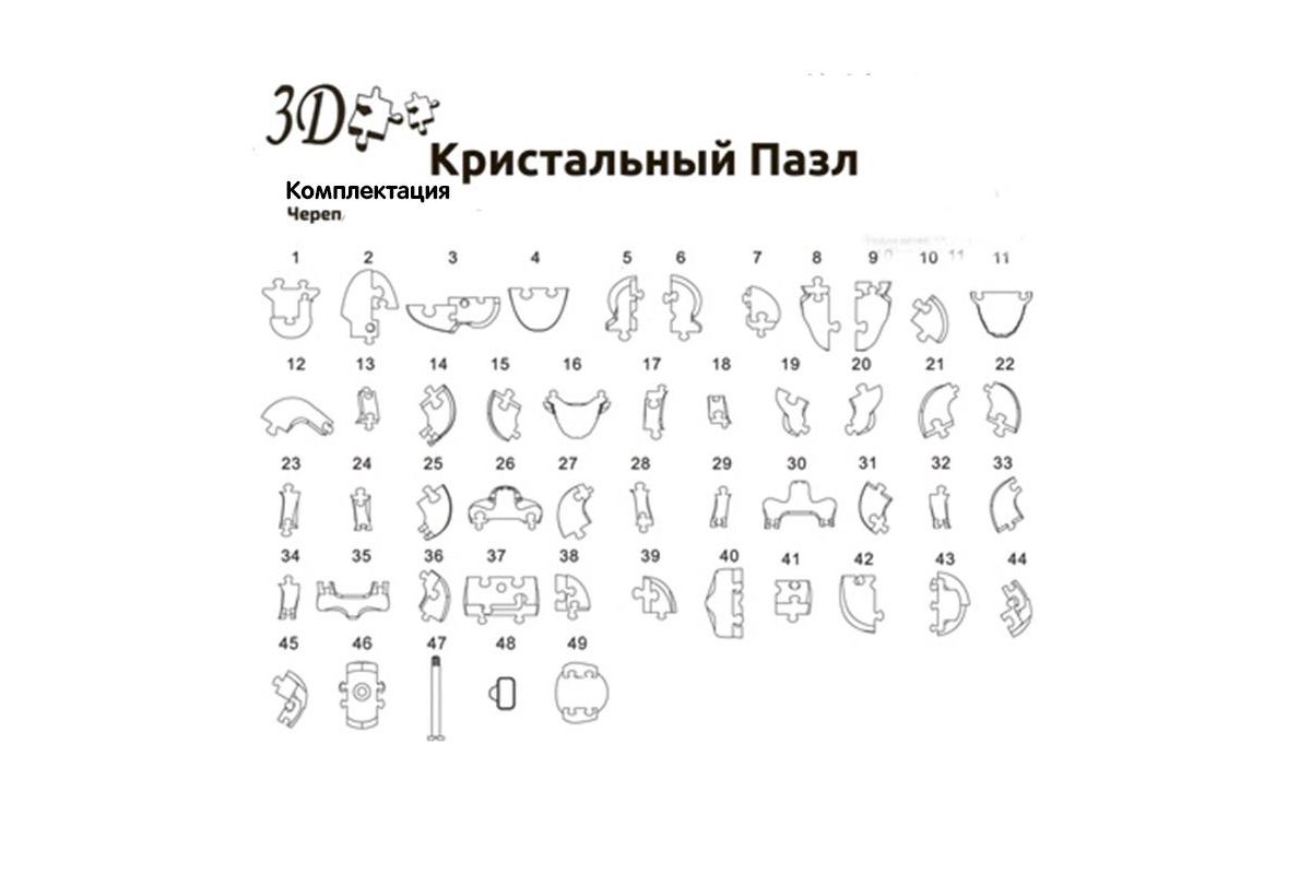 3D Crystal Puzzle - Череп без светящегося элемента. Детали изготовлены из высококачественной пластмассы, надежно скрепляются между собой и не разваливаются сами по себе, но при необходимости разбираются без особого труда. Конструктор состоит из 49 деталей, имеет четкую и понятную инструкцию. Возрастное ограничение 6 + Сложность сборки 3. Размер изделия: 7х10х10 см. Сборка осуществляется путем последовательного скрепления деталей. Схематичная инструкция находится внутри или на задней стороне коробки