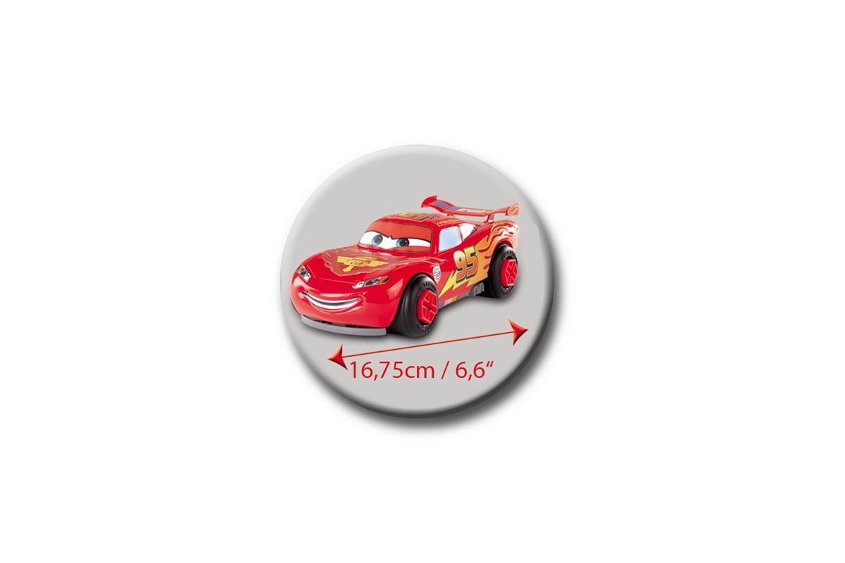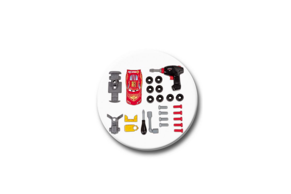 В комплекте идет машинка Молния МакКуин, дрель, запасные колеса и бампер, бензобак, отвертка и разводной ключ.