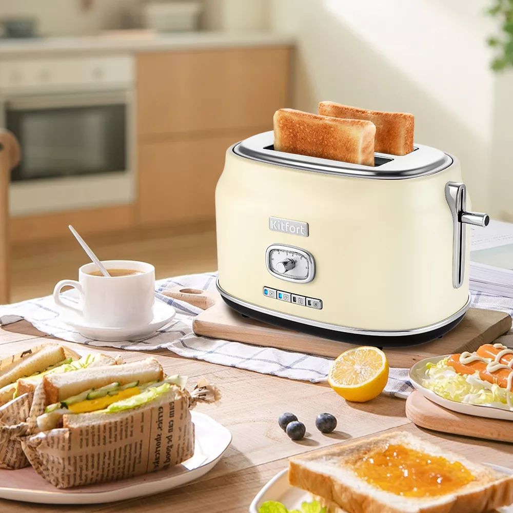 Тостер Kitfort КТ-2075 создан для тех, кто любит полакомиться ароматным и хрустящим поджаренным хлебом. Особый вкус и цвет тостов получаются такими благодаря карамелизации сахара, содержащегося в муке, в процессе приготовления. Тостер оснащён регулятором степени обжаривания и 4 кнопками. Есть режим подогрева для подогрева готовых тостов, разморозка, а также режим бейгл для поджарки рогаликов или других мучных изделий, которые требуют более интенсивной прожарки. Благодаря широким слотам можно поджаривать толстые куски хлеба, а не только тонкие. Загруженные тосты автоматически центрируются, чтобы их обжарка с двух сторон была равномерной независимо от толщины куска. По окончании приготовления тосты поднимаются вверх. Механизм экстра-подъёма позволяет приподнять тосты выше для удобного извлечения тостов небольшого размера. Снизу расположен выдвижной поддон для крошек, поэтому чистить тостер просто и удобно! Чтобы ваши завтраки были не только вкусными, но и радовали глаз, мы создали для вас коллекцию из тостера и чайника КТ-6150. Доступны в бежевом, чёрном и красном цветах