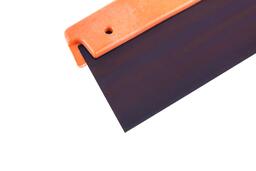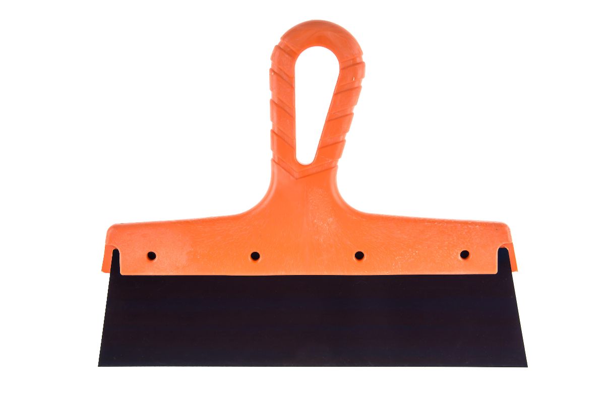 - Рукоятка изготовлена из пластика оранжевого цвета, полотно из пружинной стали с оксидированным покрытием, защищающим от коррозии и улучшающим скольжение по шпаклевке.