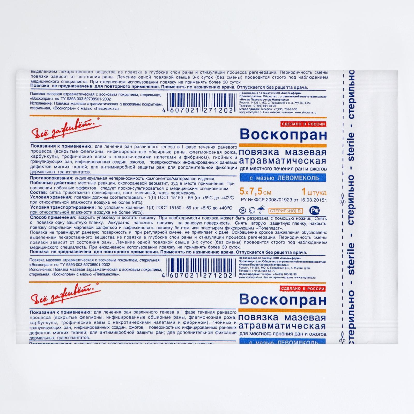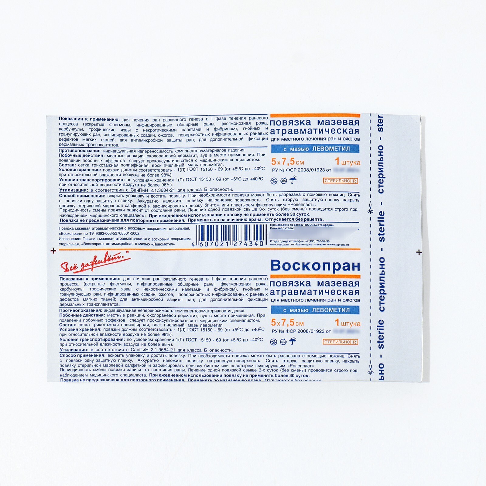 Повязка "Воскопран" с мазью "Левомеколь" 5*7,5 см, 1 шт.