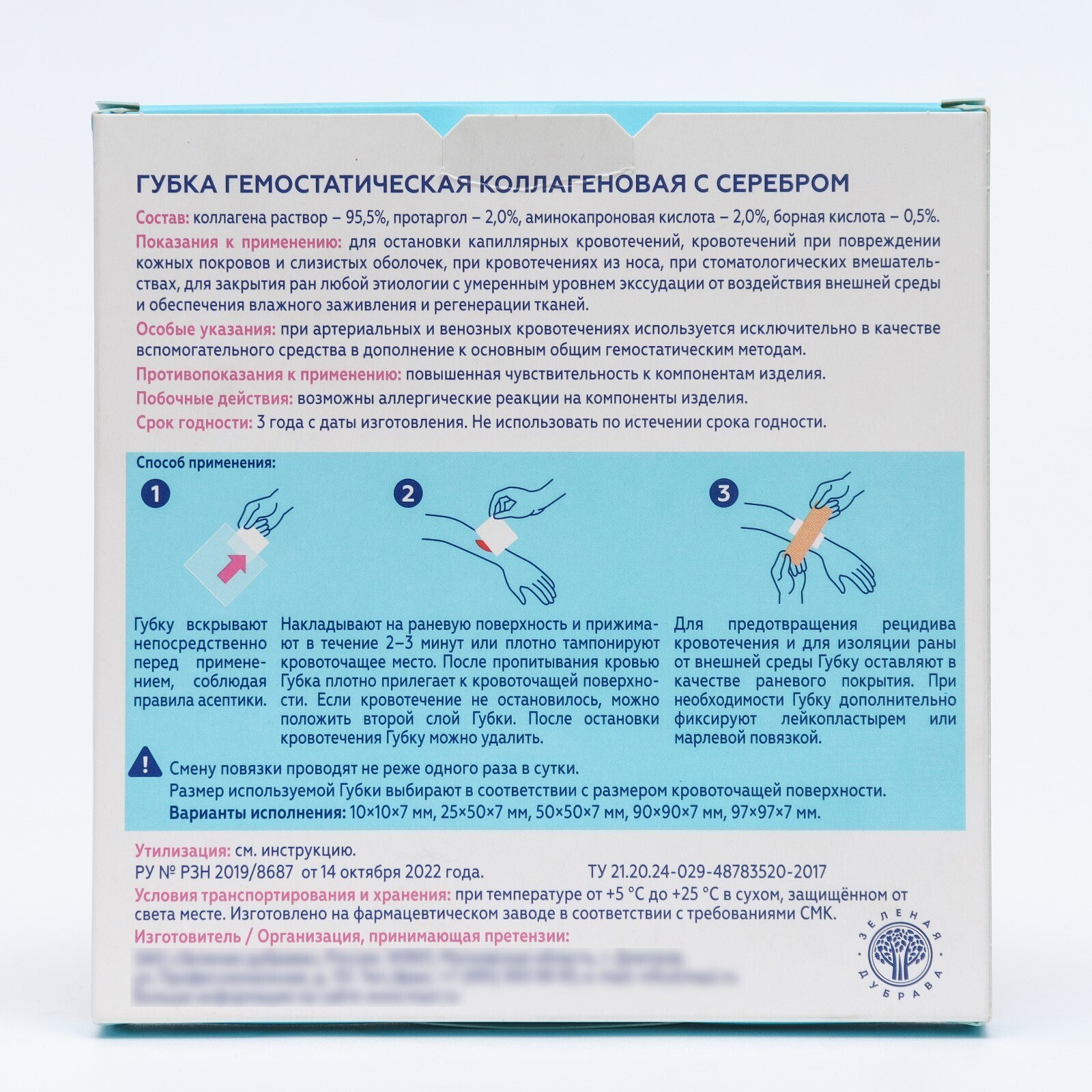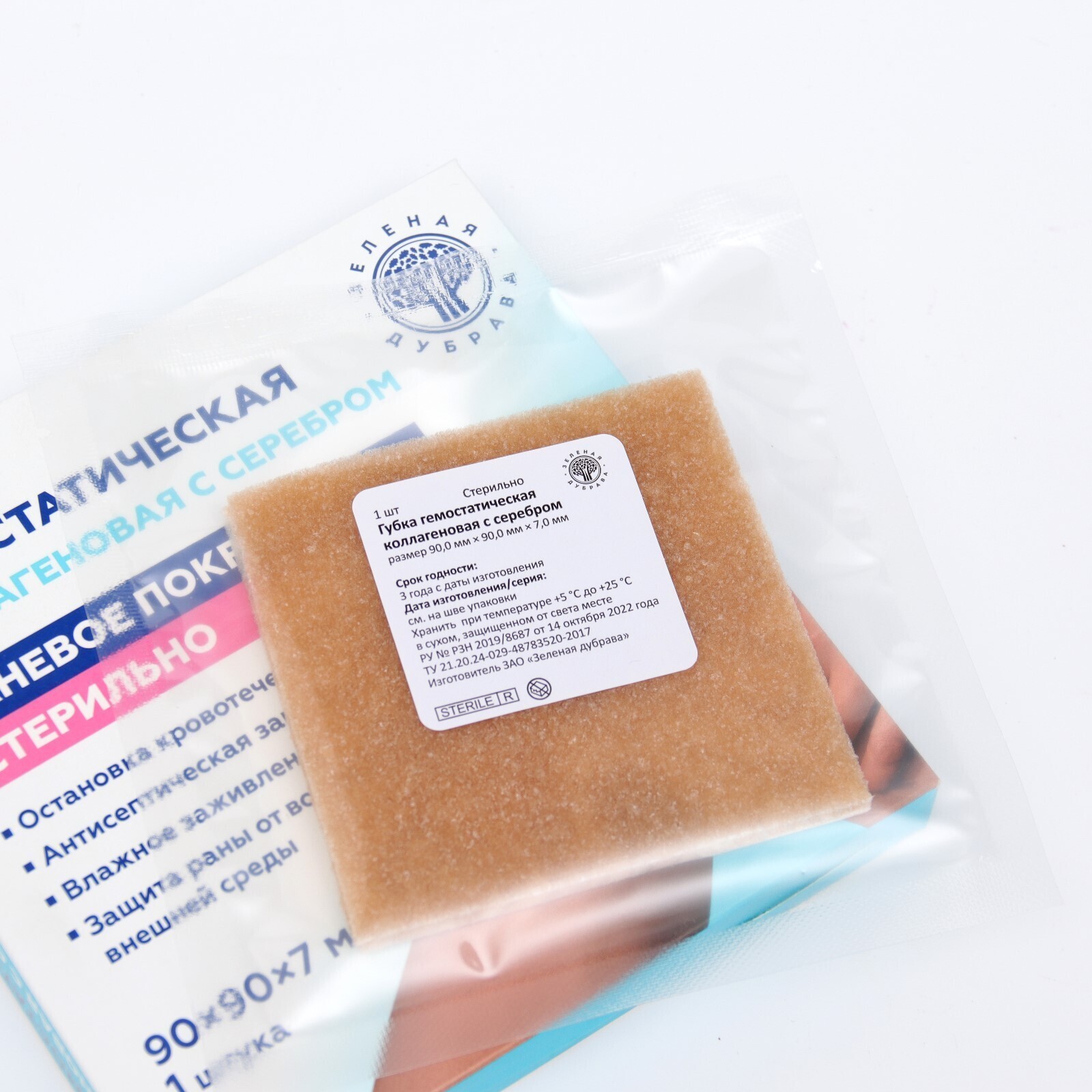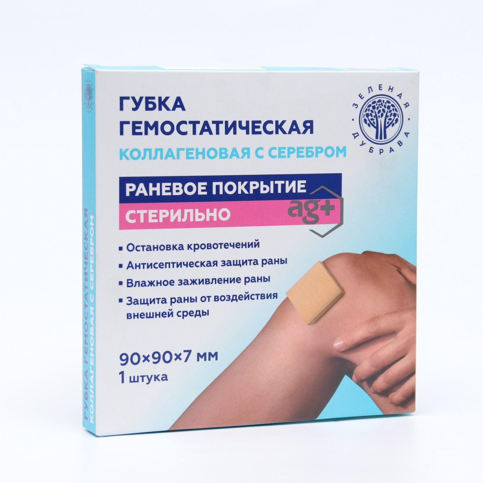 Губка гемостатическая кровоостанавливающая коллагеновая с серебром представляет собой гемостатическое рассасывающееся медицинское изделие и предназначена для применения в качестве раневого покрытия в хирургии, травматологии, дерматологии и стоматологии или в домашних условиях как местное средство для остановки капиллярных и паренхиматозных кровотечениях, для тампонады синусов твердой мозговой оболочки, для остановки кровотечения из костномозгового канала, остановки кровотечения после удаления зуба, для заполнения дефектов паренхиматозных органов.
