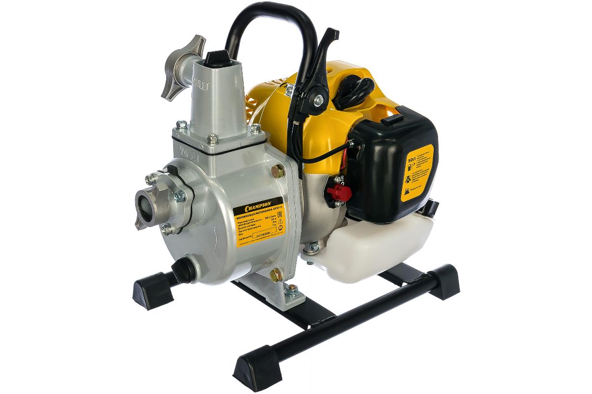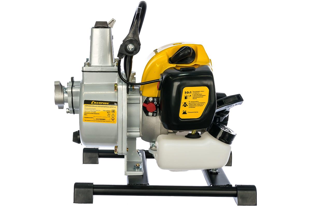 Бензиновая мотопомпа Champion GP27-II пригодится для перекачки чистой воды. Будет полезна на строительной площадке или на даче. Мотор мощностью 1,22 л.с. работает на смеси бензина АИ-92 + моторного масла (в пропорции 50:1).