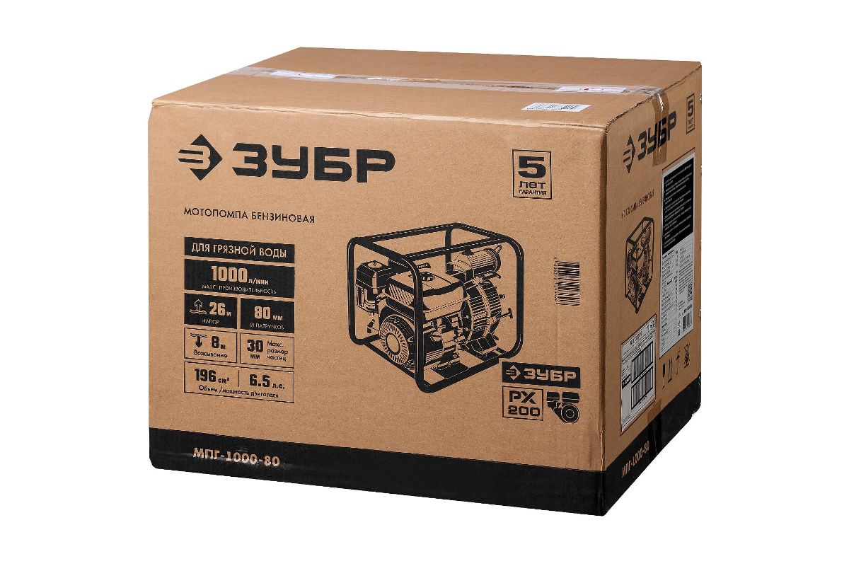 ЗУБР МПГ-1000-80 – бензиновая мотопомпа для перекачивания чистой или загрязнённой воды из колодцев, бассейнов, скважин, водоёмов, осушения подвалов, складов и т.д. Мощность 6,5 л.с. Производительность 1000 л/мин. Пригодится на даче, в саду или за городом.
