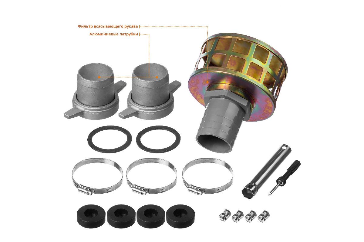 Мотопомпа подходит для воды с частицами грязи и пыли до 30 мм. На всасывающем шланге расположен фильтр грубой очистки.