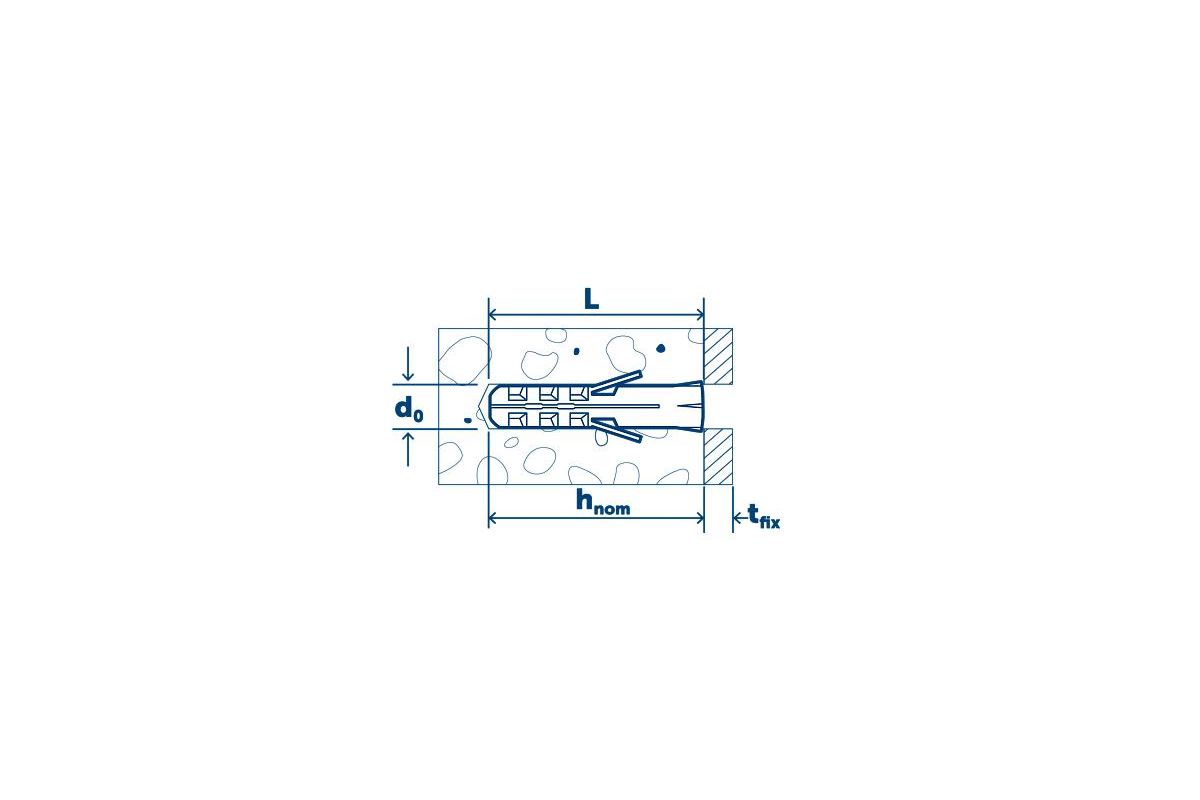 - Длина шурупа = длина дюбеля (L) + толщина прикрепляемого материала (tfix) + 5 мм;