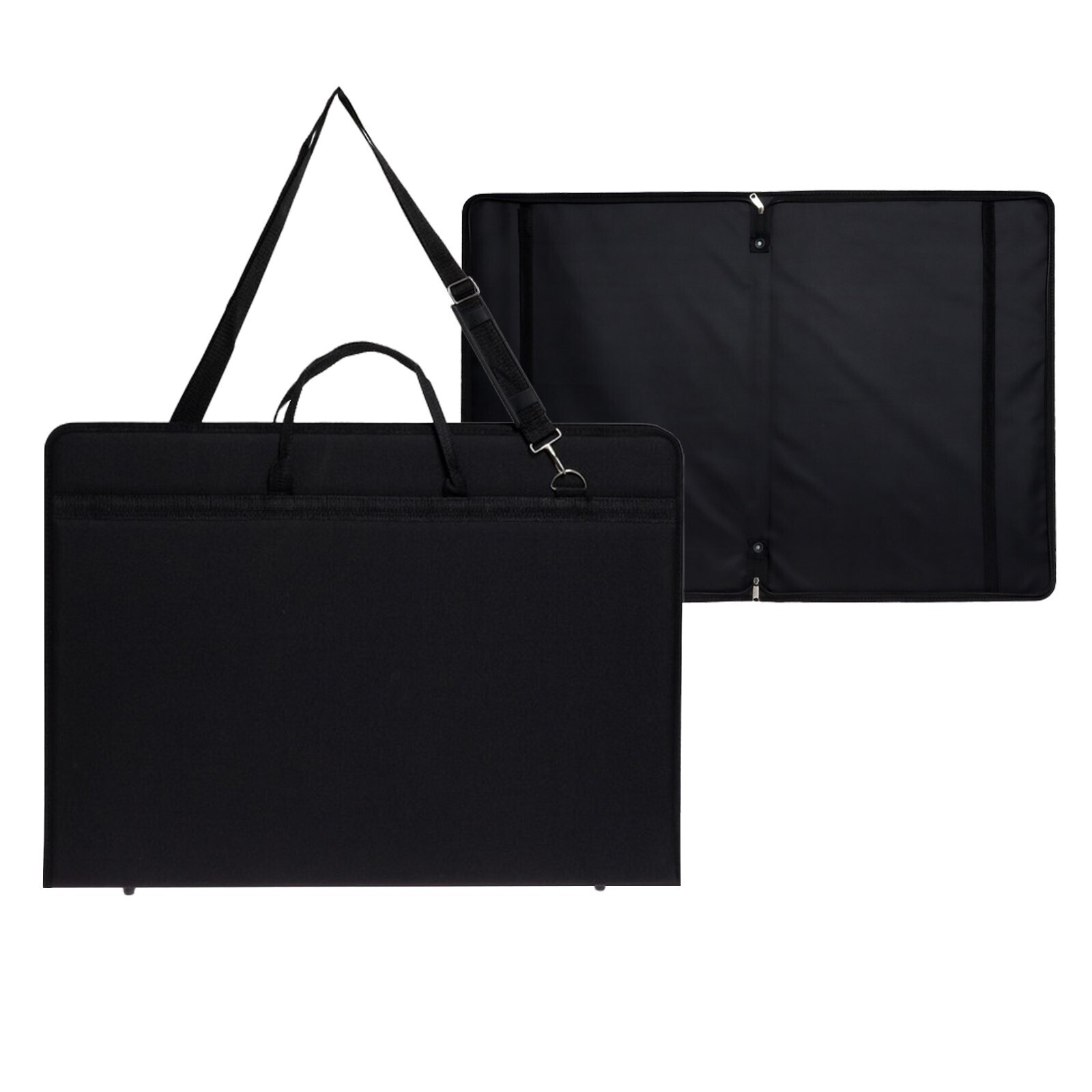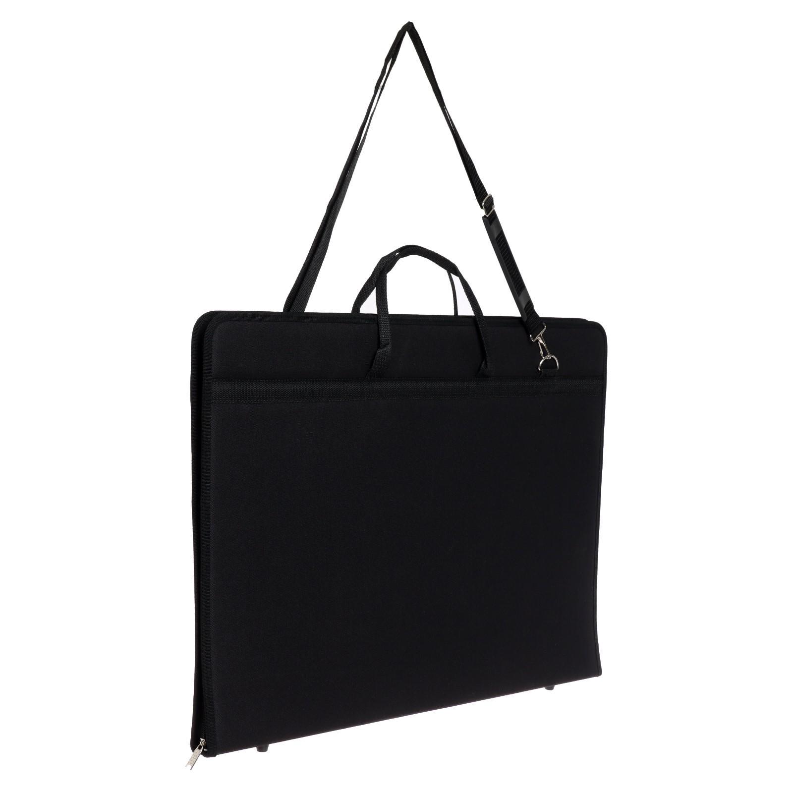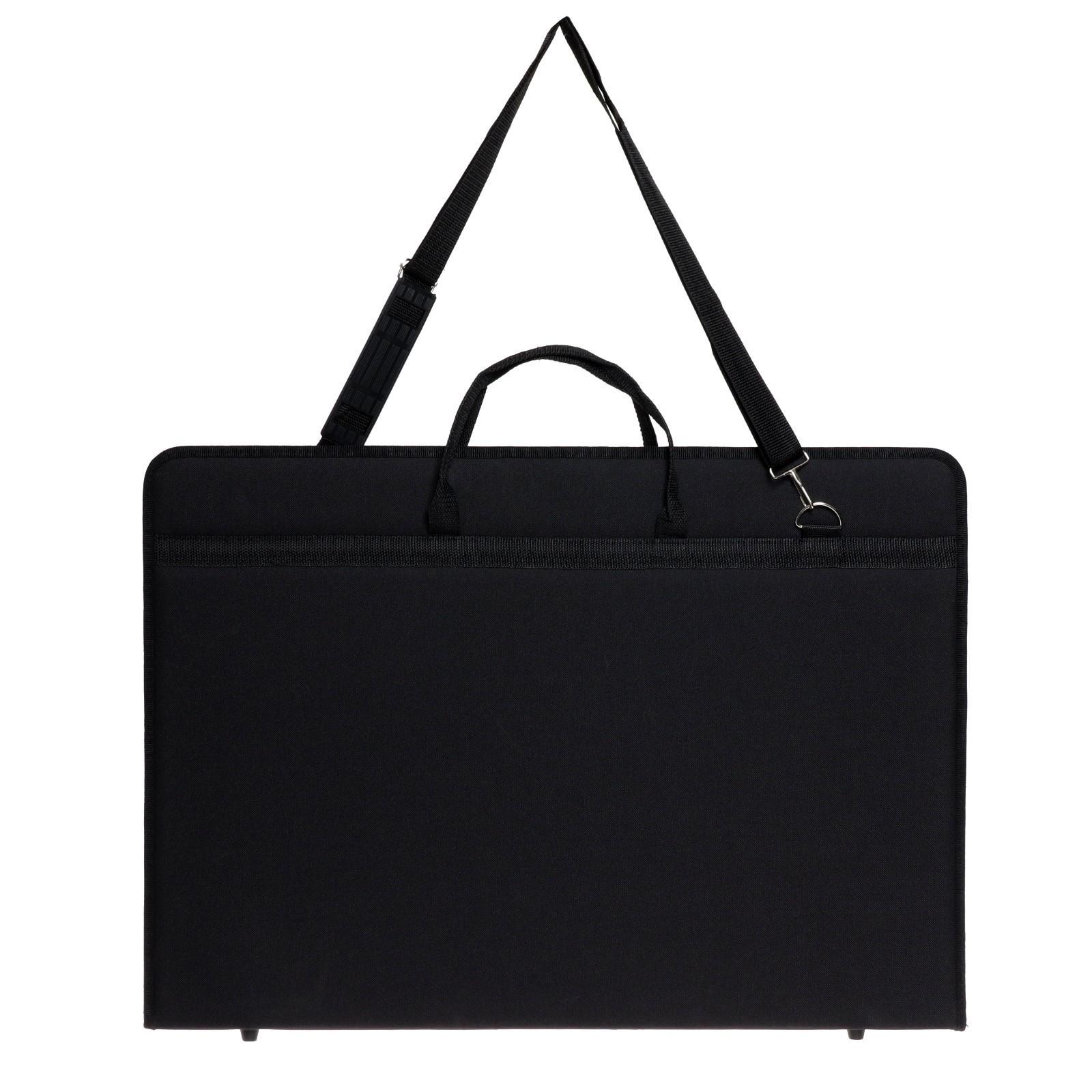 Папка - сумка А2, предназначена для переноски и хранения альбомов, планшетов, отдельных листов и завершенных работ на бумаге. Внутри папки эластичная отстегивающаяся лента для фиксации листов. По периметру папка застегивается на широкую молнию. Для удобства переноски имеется две ручки и наплечный ремень.
