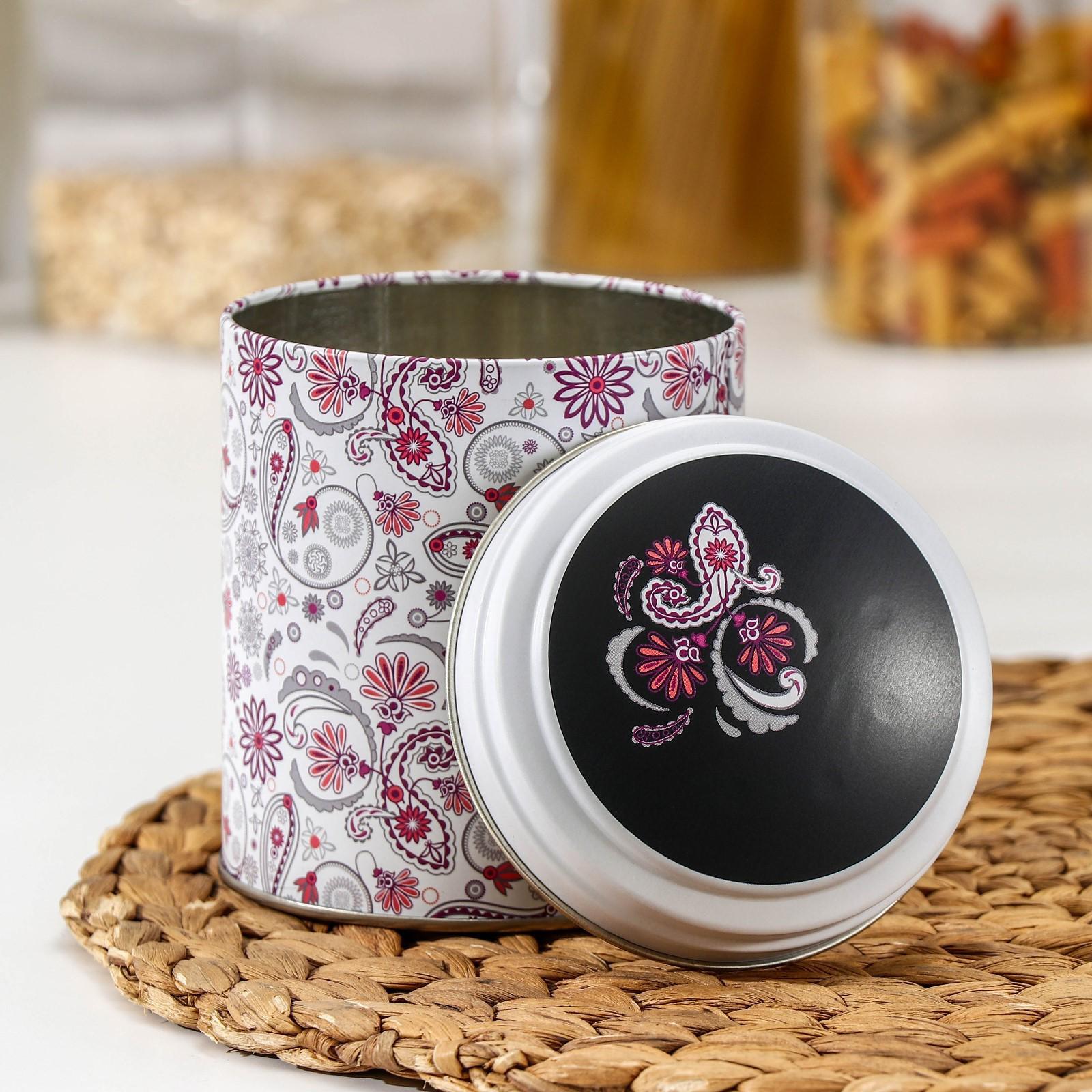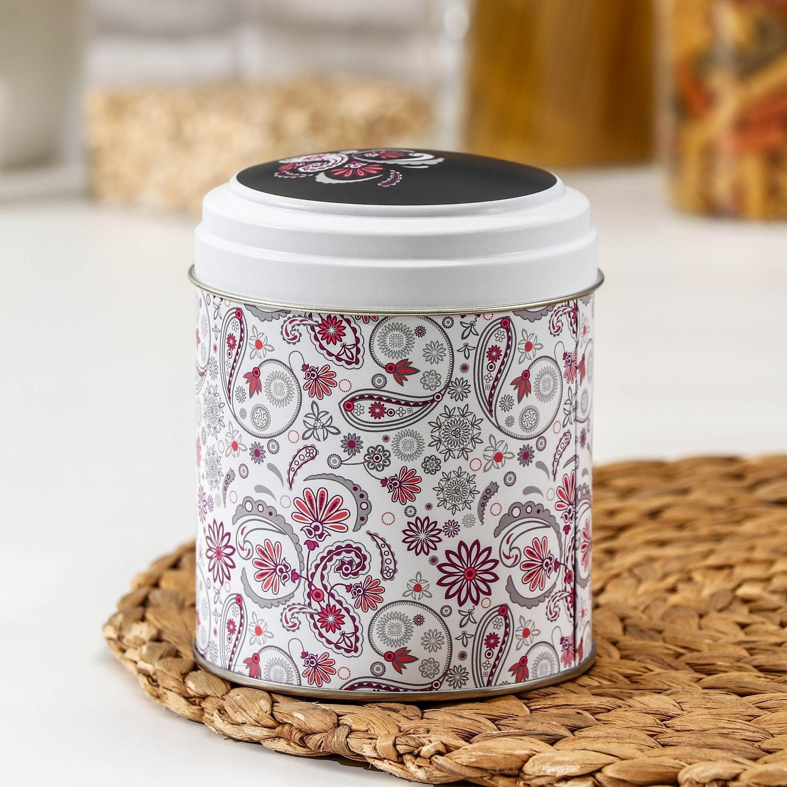 Банка для сыпучих продуктов изготовлена из жести. Крышка плотно закрывается и защищает еду от излишней влаги и проникновения посторонних запахов.