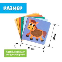 В развивающем наборе «Животные фермы» есть множество тактильных элементов на карточках с животными. Они представлены вкладками, соответствующими поверхности тела каждого зверька.