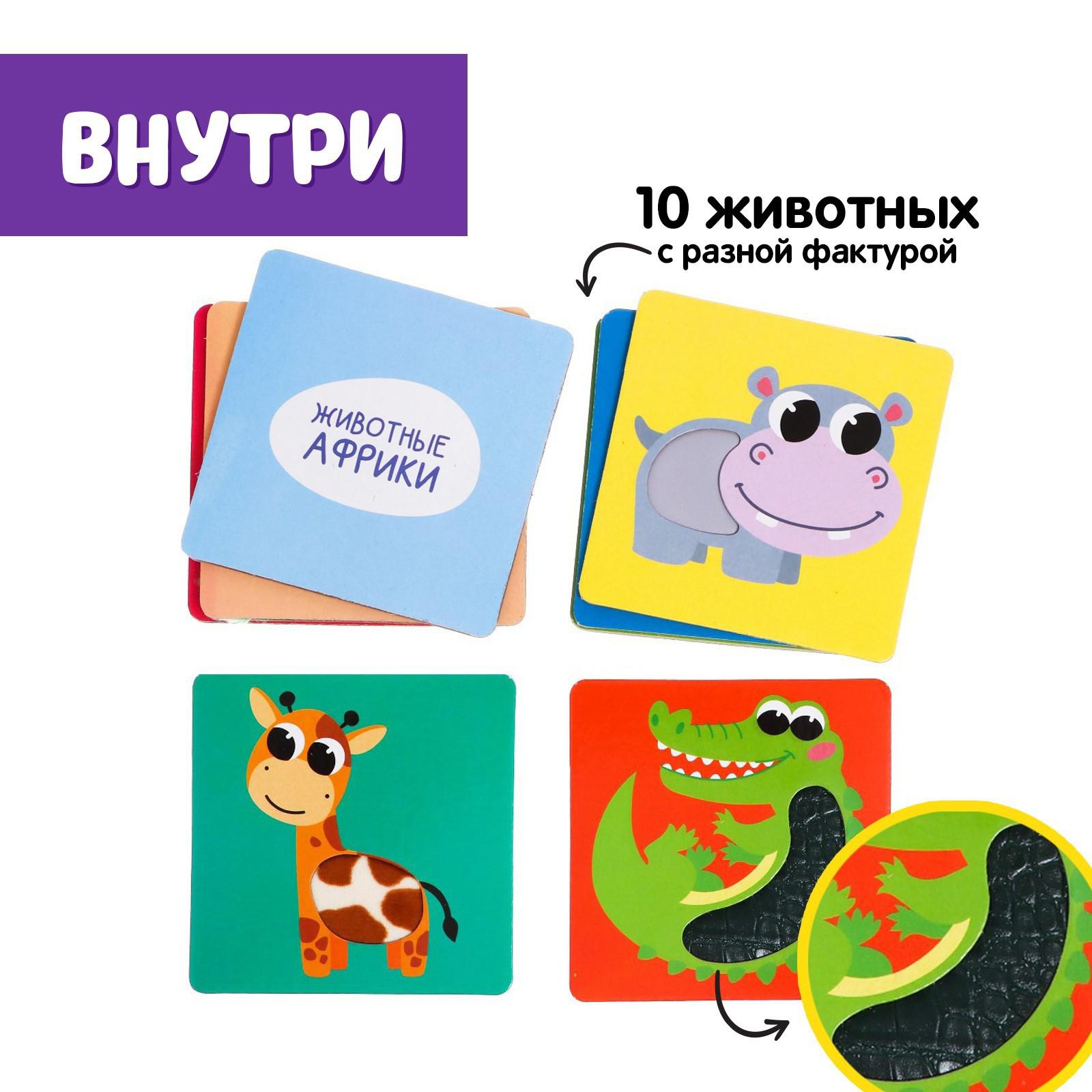 В развивающем наборе «Животные Африки» есть множество тактильных элементов на карточках с животными. Они представлены вкладками, соответствующими поверхности тела каждого зверька.