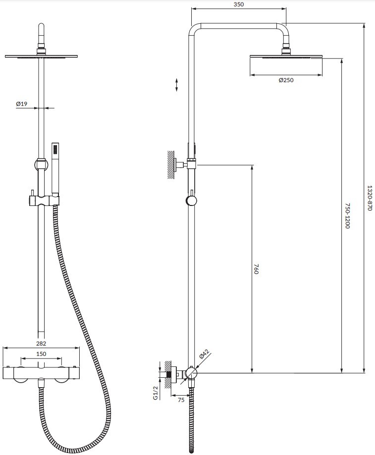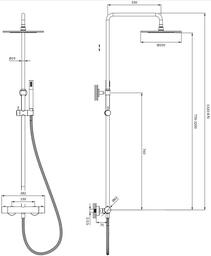 • Комплектация ручной душ (душевая лейка)верхний душ (тропический)смесительстойка / штангадушевой шлангкрепление ручного душа