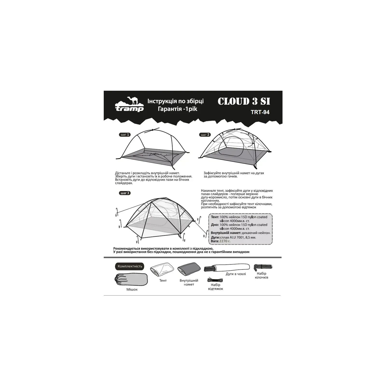 Ультралегкий двомісний туристичний намет хабової конструкції Tramp Cloud 3 Si світло-сіра з силіконізованого Rip-Stop нейлону вагою всього 2100 гр.
