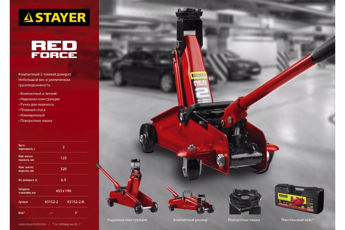 Домкрат STAYER 43152-2-K гидравлический подкатной red force 2т 125-320мм в кейсе