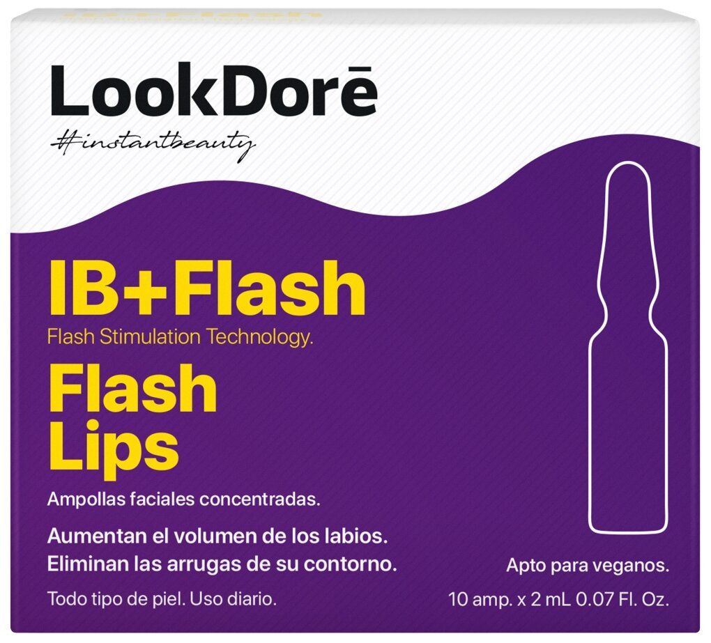 Концентрированная сыворотка в ампулах для губ IB + Flash Ampoules Flash Lips 10x2 мл для придания объема губам, сглаживания морщин по контуру губ, комфортного увлажнения даже для самых поврежденных губ. Сыворотка воздействует непосредственно на жировую ткань в области губ подобно наполнителю, увеличивая объем губ и делая более четким их контур. Гиалуроновая кислота поддерживает увлажненность тканей, делает губы более мягкими и упругими.