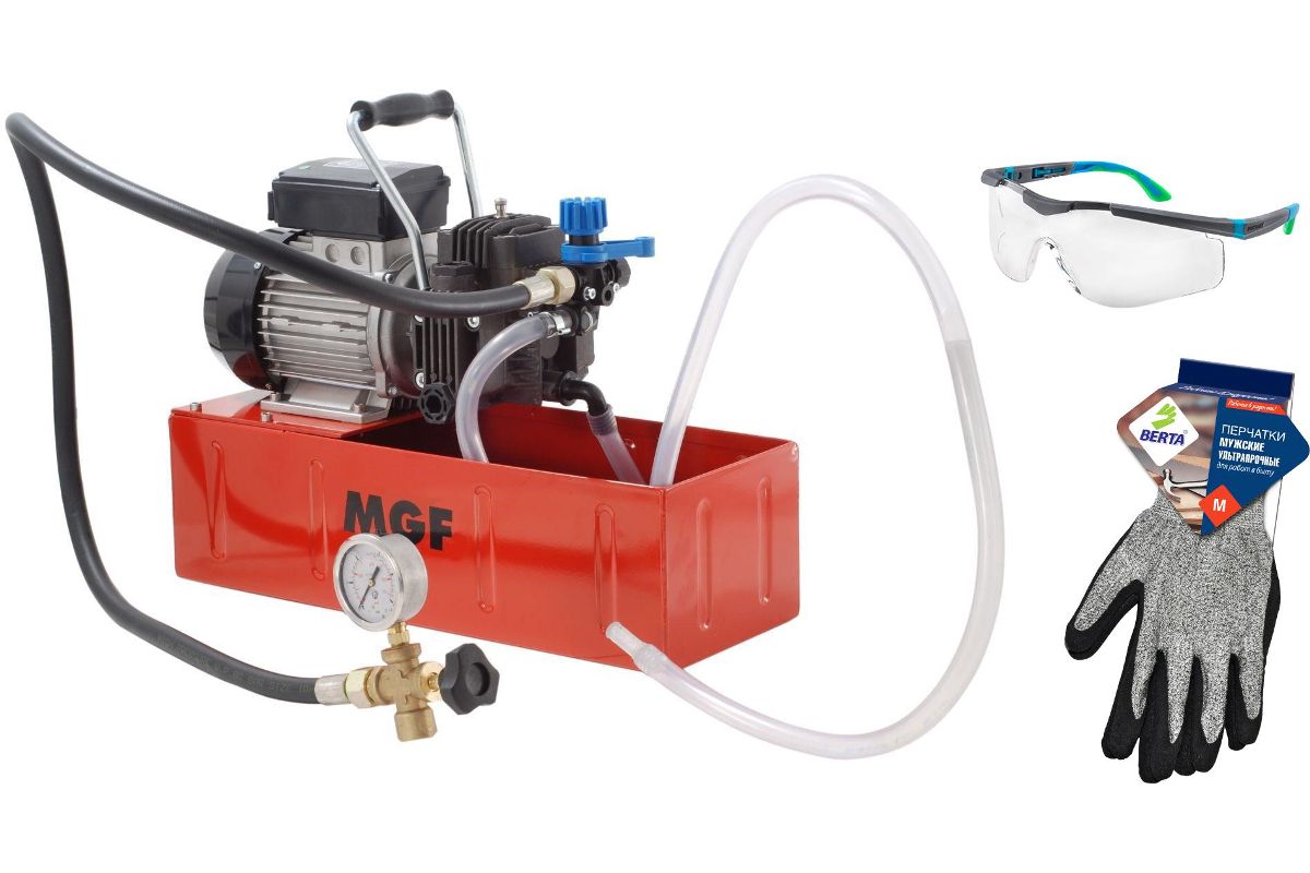В состав набора входят: Опрессовщик MGF Компакт-электро 6468 20 бар. 17 лит/мин. 0,75 кВт 220 V, Перчатки БЕРТА 555 мужские ультрапрочные, Очки РОСОМЗ 18737 о87 arctiс strongglass 5-3.1 pc