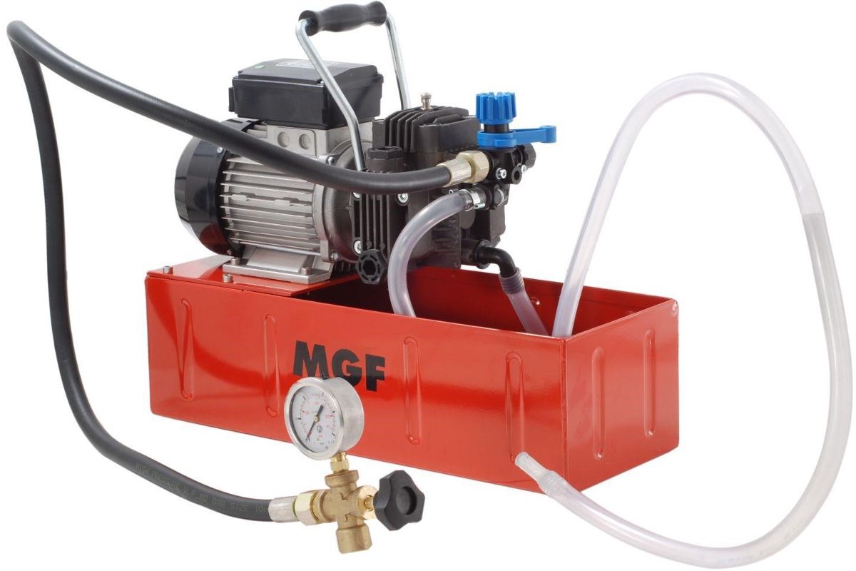 Электрический опрессовочный насос MGF Комфорт электро 100006468 прост в управлении. Разработан для испытательных установок и перекачки чистой воды под давление 0-20 атм. Имеет 12-литровый резервуар для жидкости, манометр для контроля давления, гибкий шланг для подсоединения к испытательному объекту. Обладает высокой производительностью - 17 л/мин.