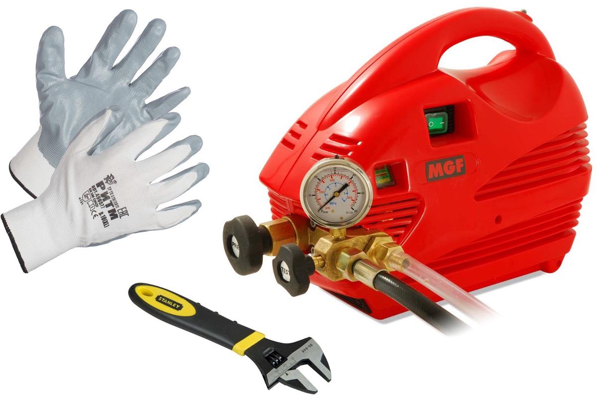 В состав набора входят: Опрессовщик MGF Compact 60 905200 электрический до 60бар, Ключ разводной STANLEY MaxSteel 0-90-948 (0 - 24 мм) 200мм, Перчатки AMPARO 496577 универсальные ''ритм'' размер 7