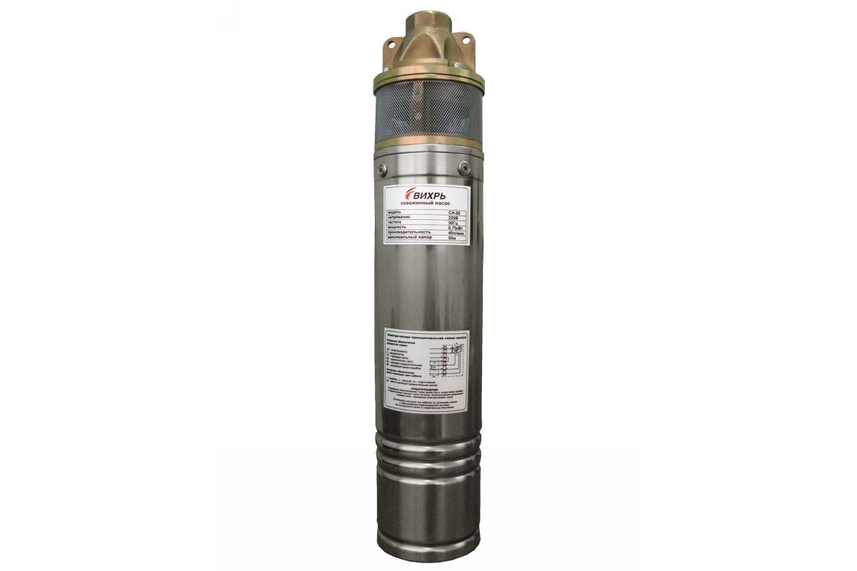 Скважинный насос ВИХРЬ СН-50 оборудован двигателем мощностью 750 Вт. Перекачивает до 2400 л воды в час и передает ее на высоту до 50 м. Подходит только для чистой воды. Помещается в скважины шириной более 102 мм.