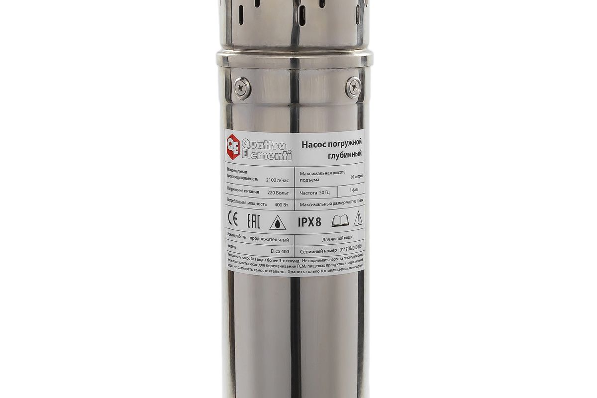 QUATTRO ELEMENTI ELICA 400 (246-968) – погружной скважинный насос для чистой воды. Производительность 2100 л/час. Подойдёт для обеспечения технической водой загородного участка: приёма душа, полива огорода, стирки белья и т.д.
