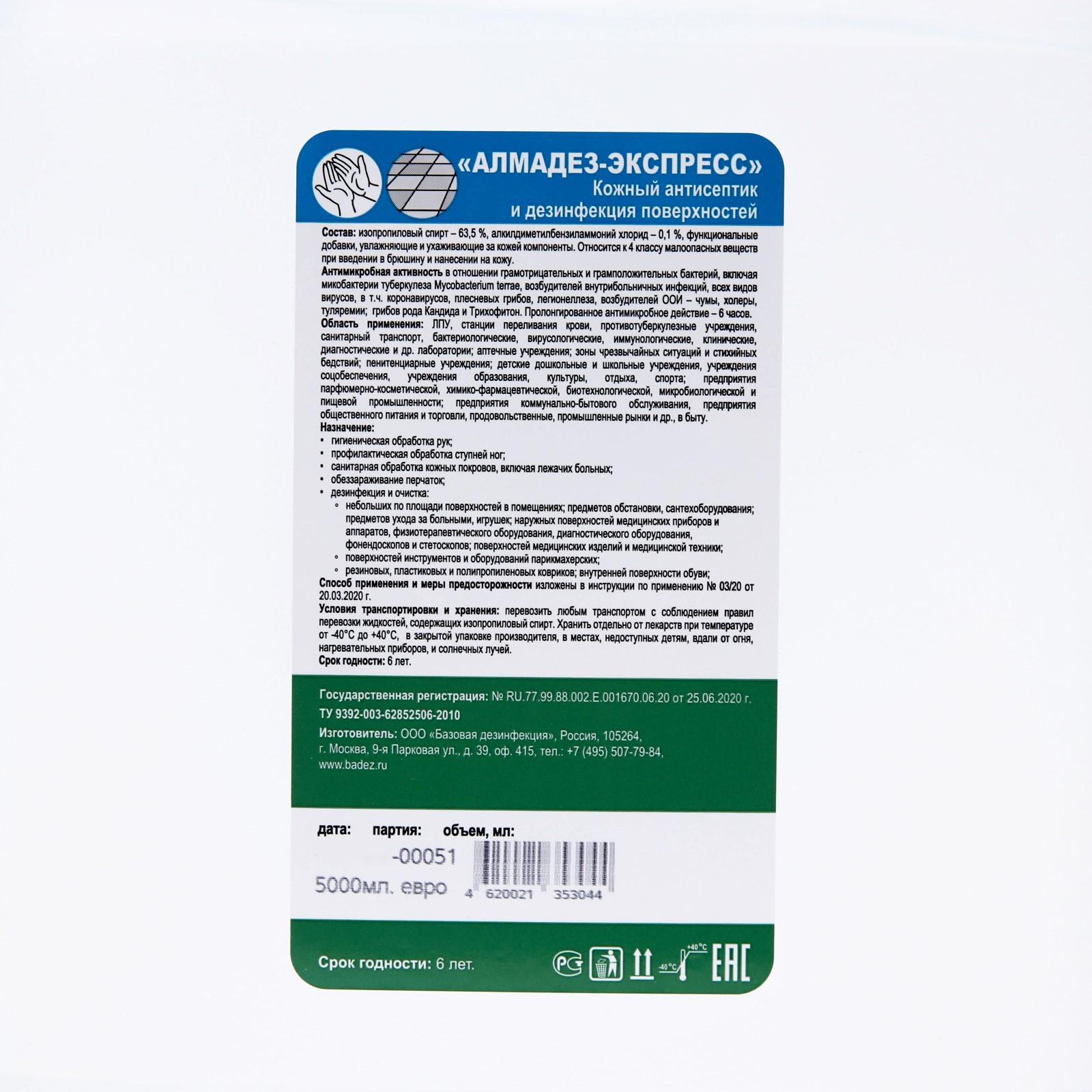 Антисептик "Алмадез-Экспресс", кожный, дезинфекция поверхностей, 5 л
