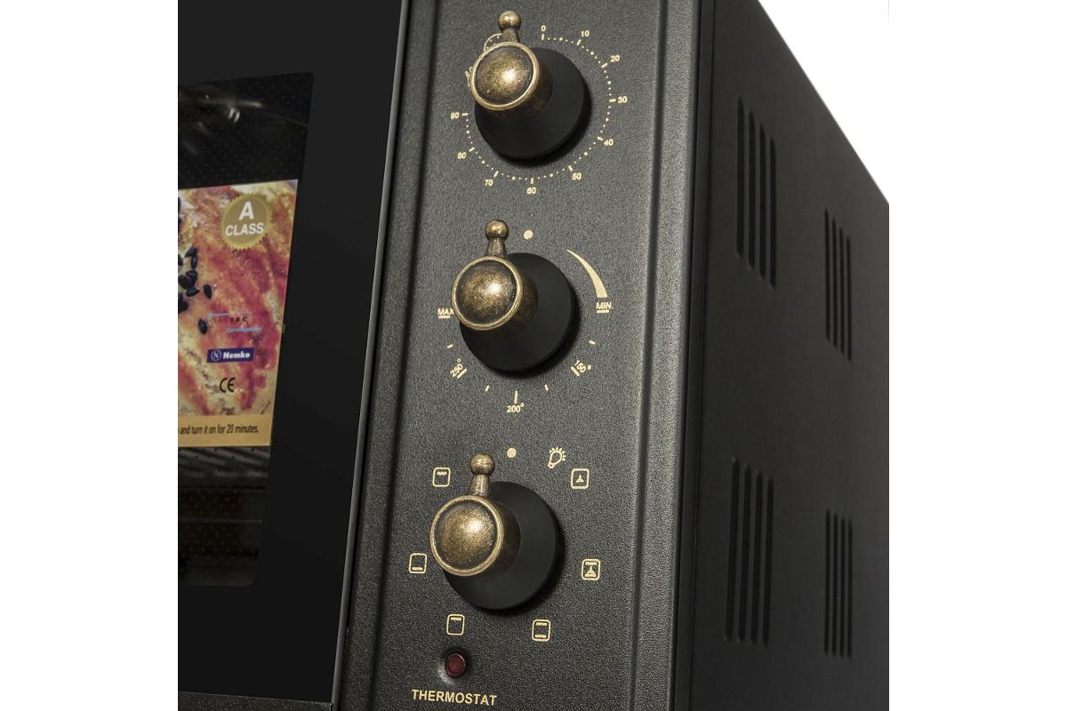 Особенности: гриль, термостат, таймер (90 мин), автоотключение, звуковой сигнал, эмаль лёгкой очистки, уплотнитель стеклянной дверцы, защитное крепление из металла для стекла, широкое термостойкое стекло, плотное крепление нагревательных элементов, нагревательные элементы из нерж. стали (нижний-скрытый), механизм легкого съема дверцы, индикатор термостата, индикатор режима конвекции