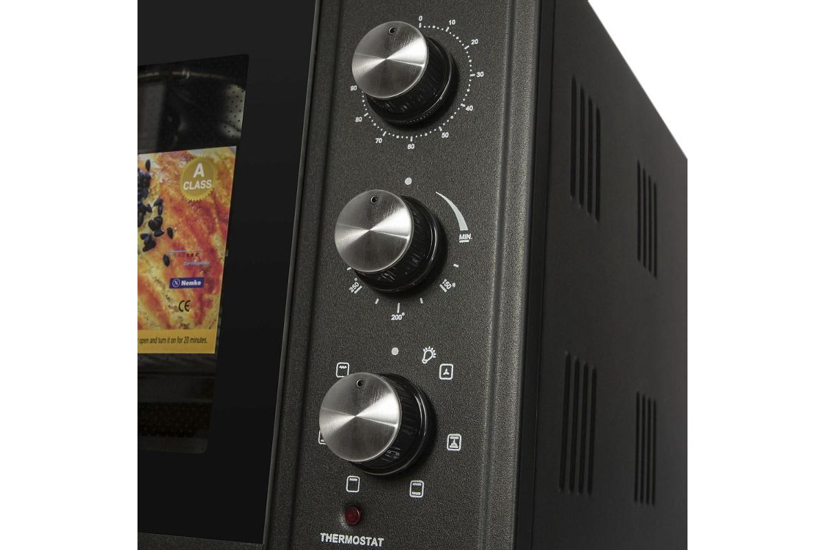 Особенности: гриль, термостат, таймер (90 мин), автоотключение, звуковой сигнал, эмаль лёгкой очистки, уплотнитель стеклянной дверцы, защитное крепление из металла для стекла, широкое термостойкое стекло, плотное крепление нагревательных элементов, нагревательные элементы из нерж. стали (нижний-скрытый), механизм легкого съема дверцы, индикатор термостата, индикатор режима конвекции