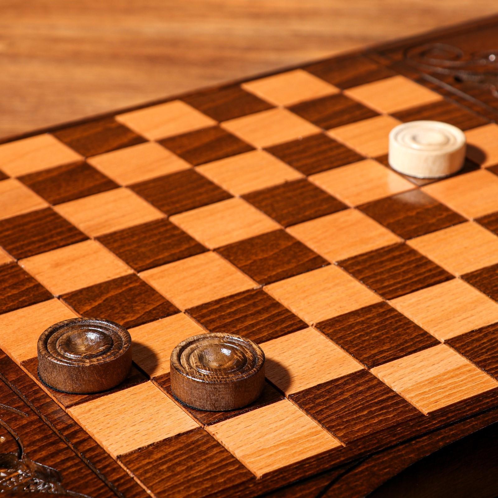 Верхняя внешняя часть доски украшена резным узором. На нижней части доски расположено шахматное поле и обрамлено резным узором. В комплект входят фишки для шашек.