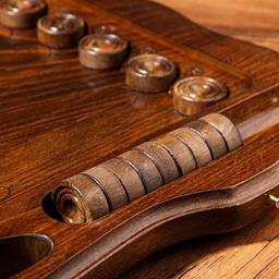 С внутренней стороны доска полностью оформлена под поле для игры в нарды. Фишки вырезаны в ручную, и имеют тканное основание для легкого скольжения по полю.