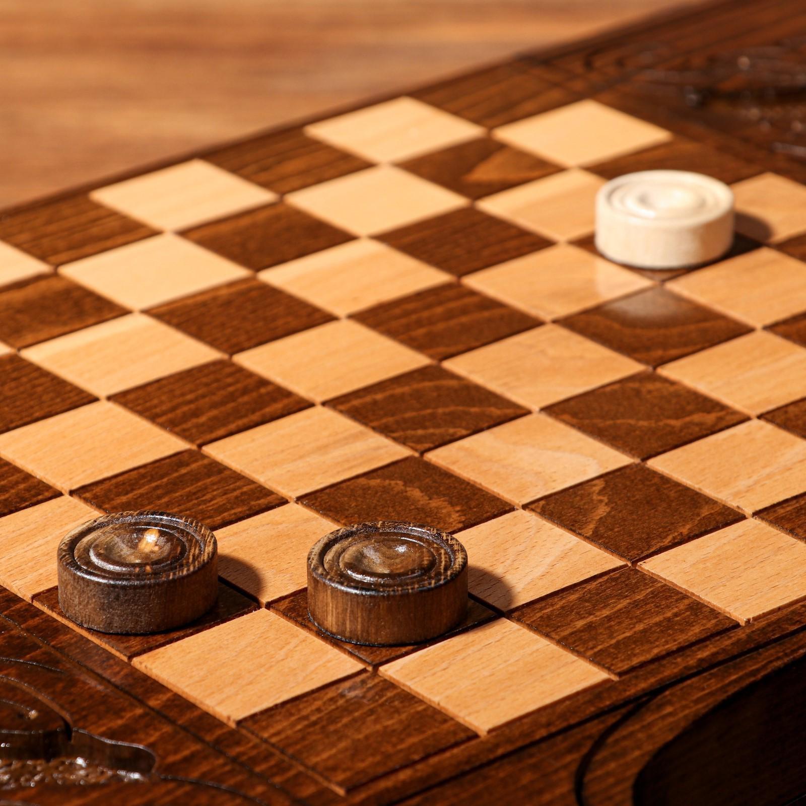 Верхняя внешняя часть доски украшена резным узором. На нижней части доски расположено шахматное поле и обрамлено резным узором. В комплект входят фишки для шашек.