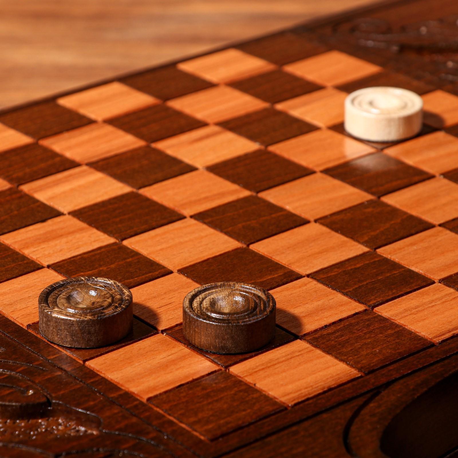 Верхняя внешняя часть доски украшена резным узором. На нижней части доски расположено шахматное поле и обрамлено резным узором. В комплект входят фишки для шашек.