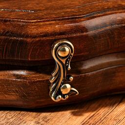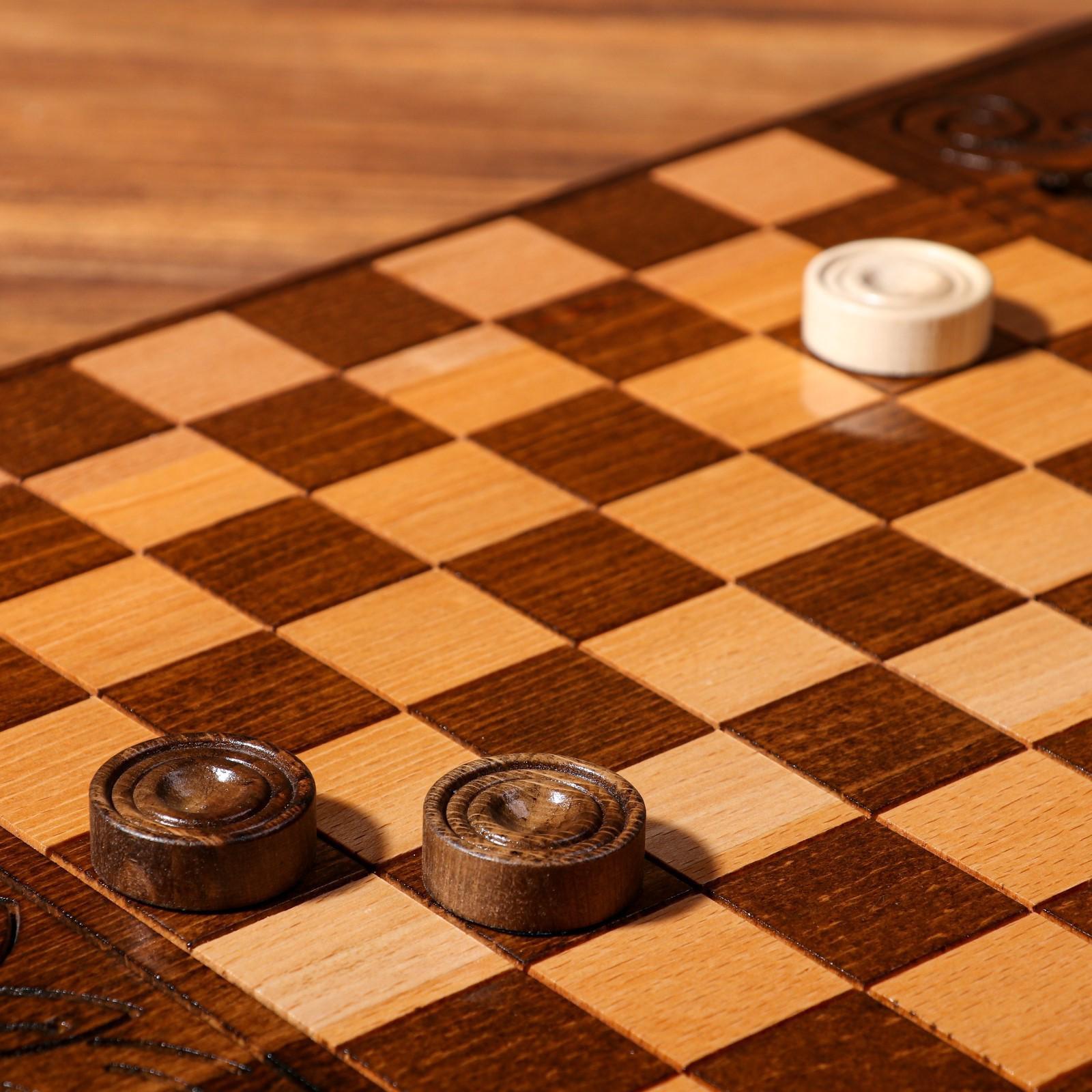 Верхняя внешняя часть доски украшена резным узором. На нижней части доски расположено шахматное поле и обрамлено резным узором. В комплект входят фишки для шашек.