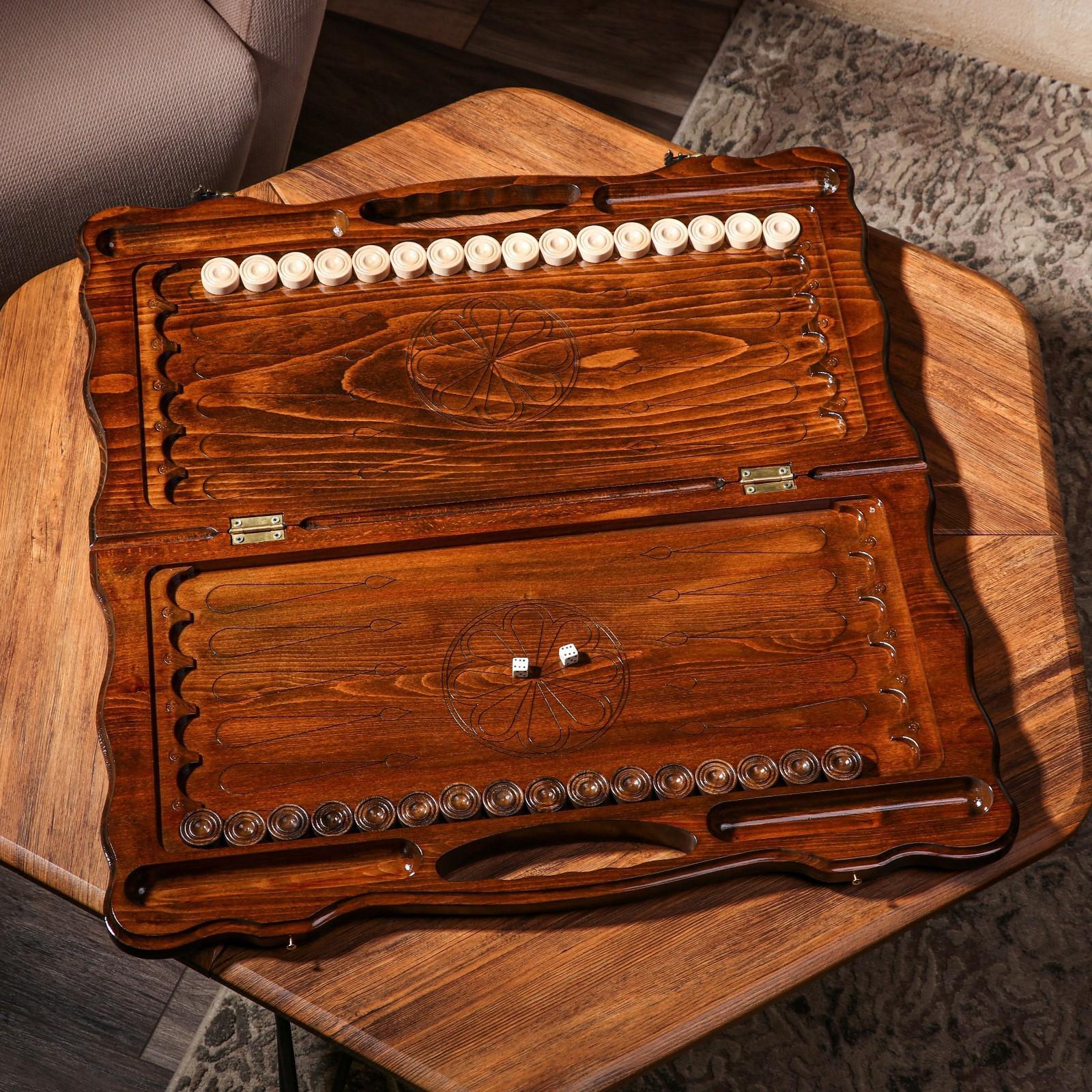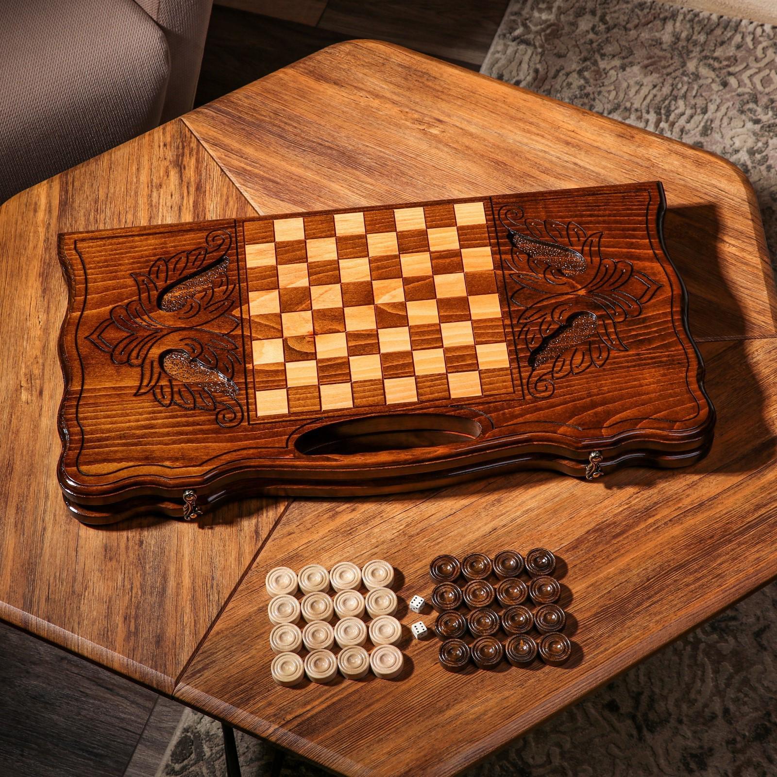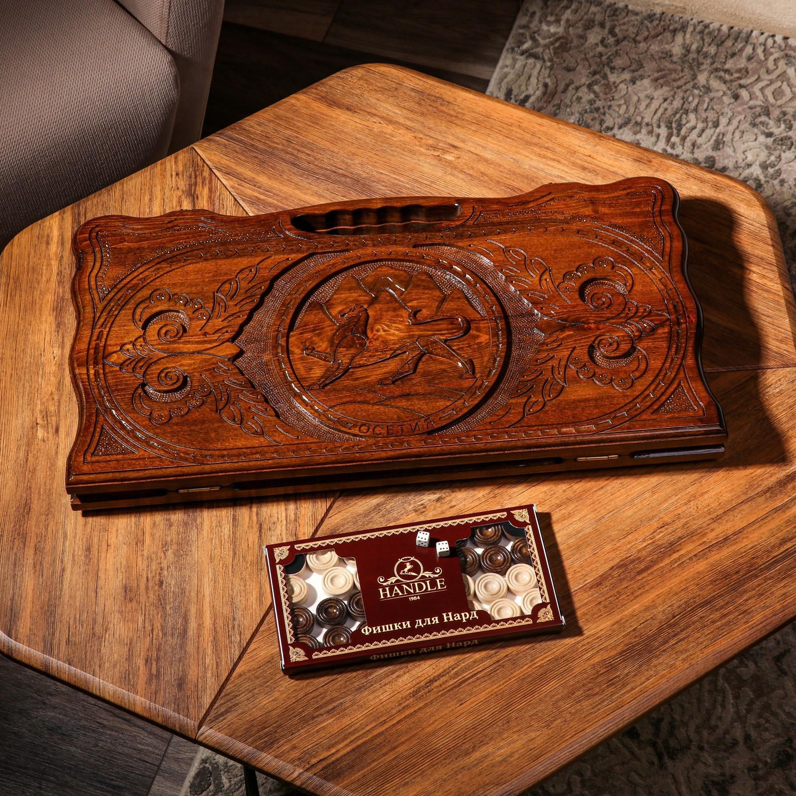 Нарды ручной работы "Горы", глубокая резка, с ручкой, 60х30 см, с шахматным полем, массив ореха, Армения