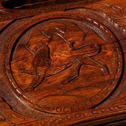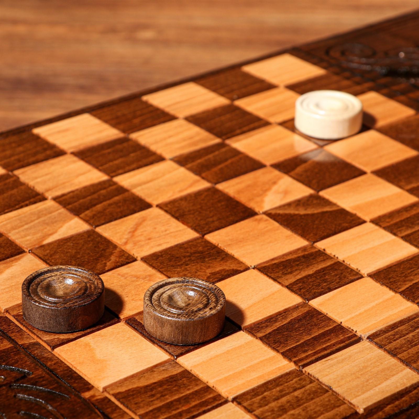 Верхняя внешняя часть доски украшена резным узором. На нижней части доски расположено шахматное поле и обрамлено резным узором. В комплект входят фишки для шашек.
