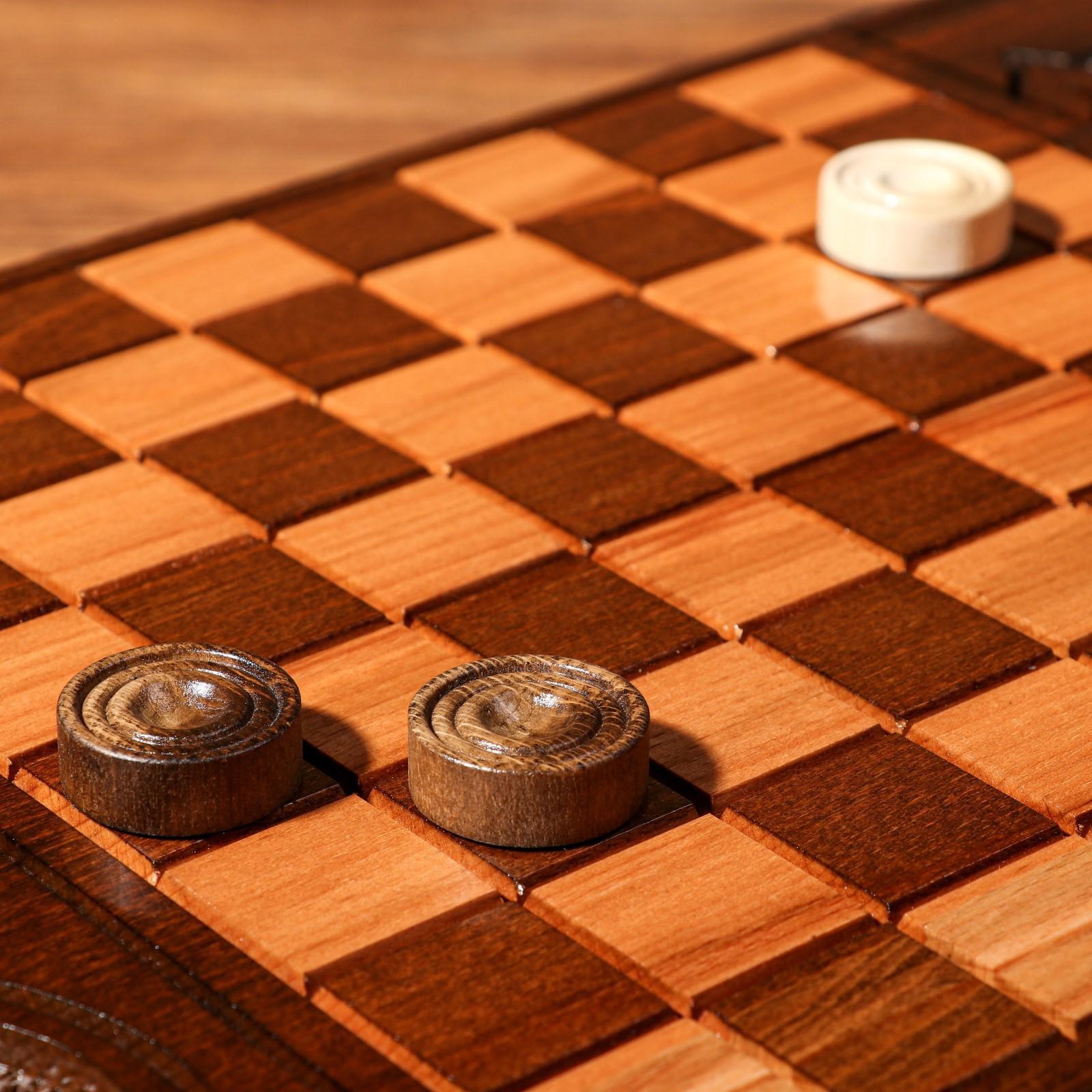 Верхняя внешняя часть доски украшена резным узором. На нижней части доски расположено шахматное поле и обрамлено резным узором. В комплект входят фишки для шашек.