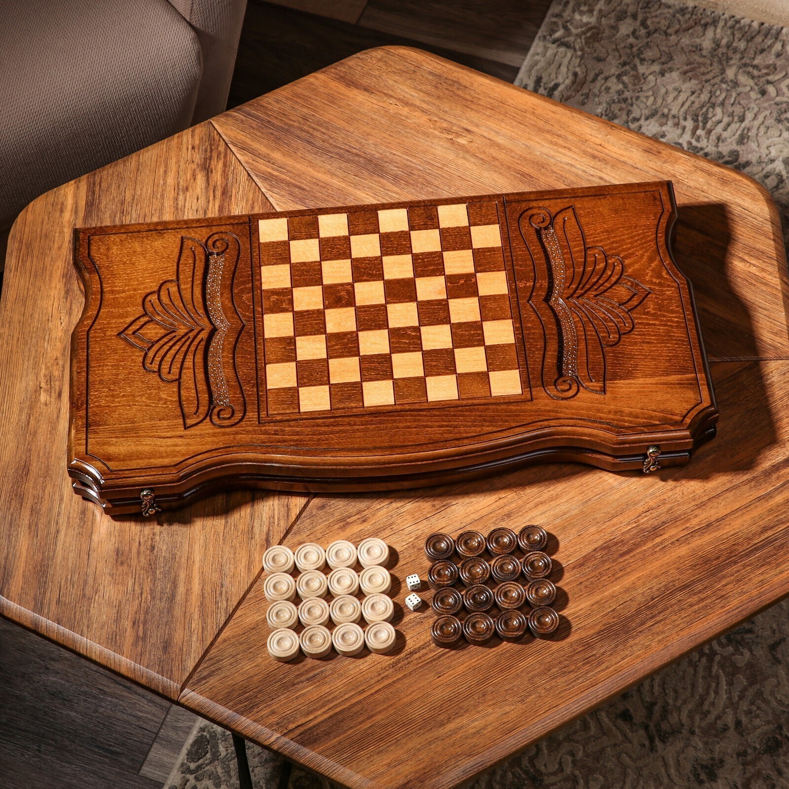 Нарды ручной работы - это классическая настольная игра, проверенная веками. Каждые нарды выполнены мастерами в ручную из высококачественного массива ореха.