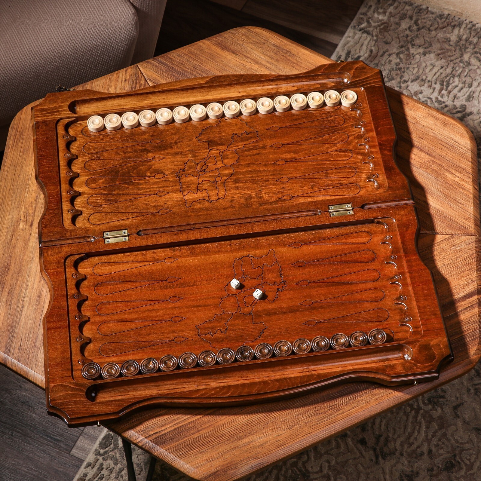 С внутренней стороны доска полностью оформлена под поле для игры в нарды. Фишки вырезаны в ручную, и имеют тканное основание для легкого скольжения по полю.