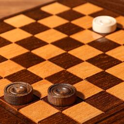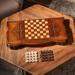 Верхняя внешняя часть доски украшена резным узором. На нижней части доски расположено шахматное поле и обрамлено резным узором. В комплект входят фишки для шашек.