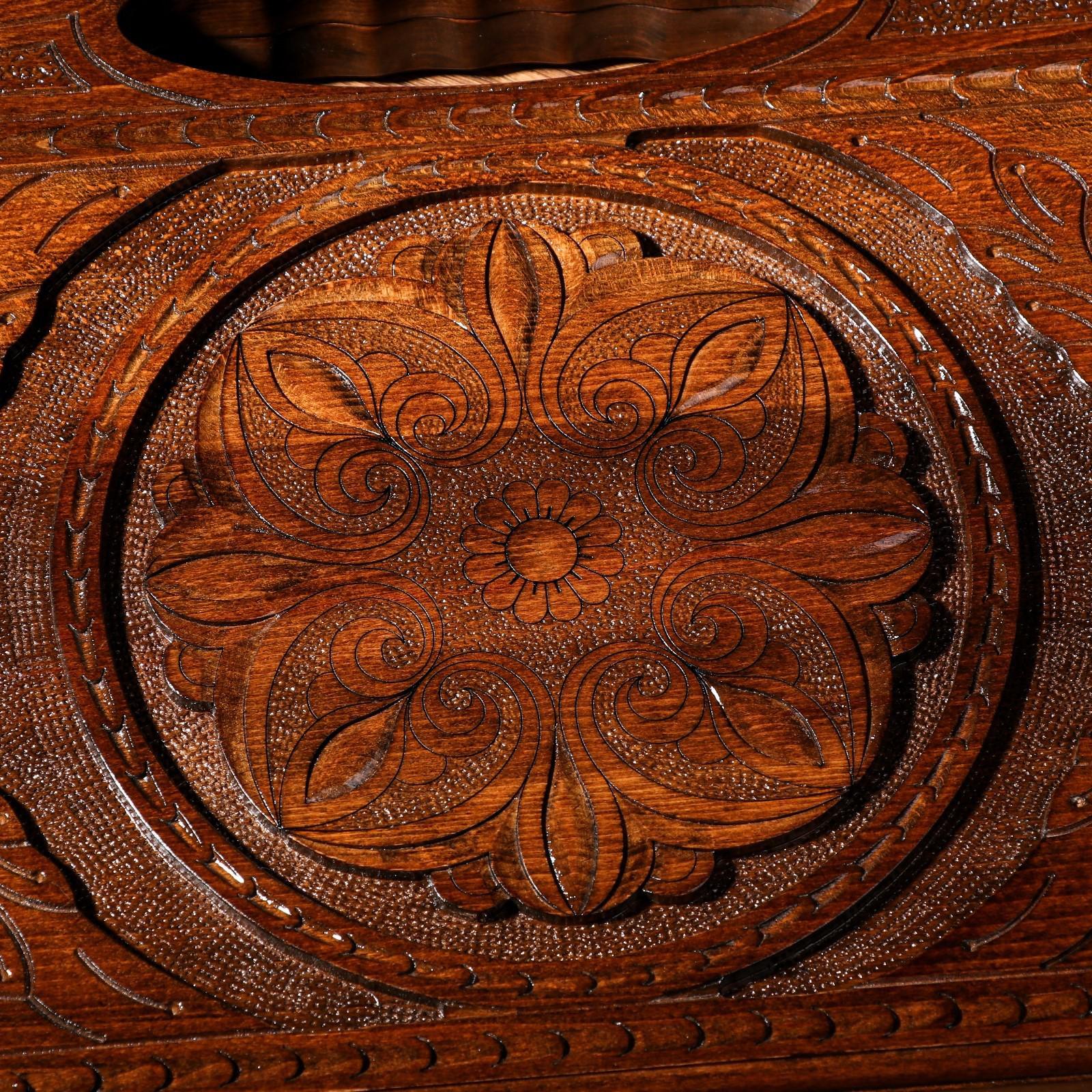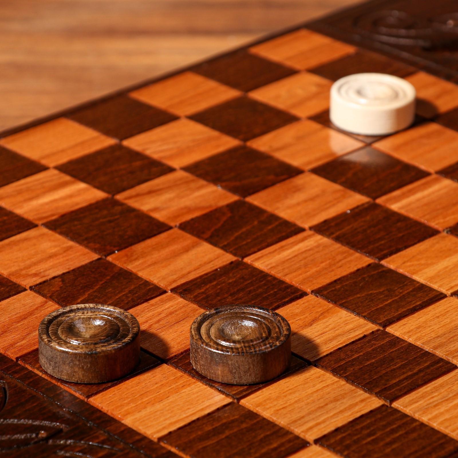 Верхняя внешняя часть доски украшена резным узором. На нижней части доски расположено шахматное поле и обрамлено резным узором. В комплект входят фишки для шашек.