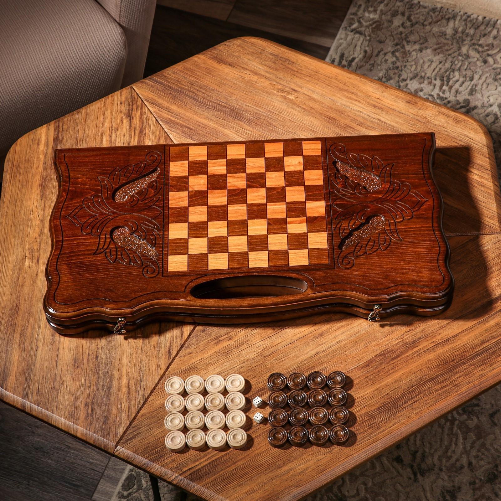 Нарды ручной работы "Абрис" с ручкой, 60х30 см, с шахматным полем, массив ореха, Армения