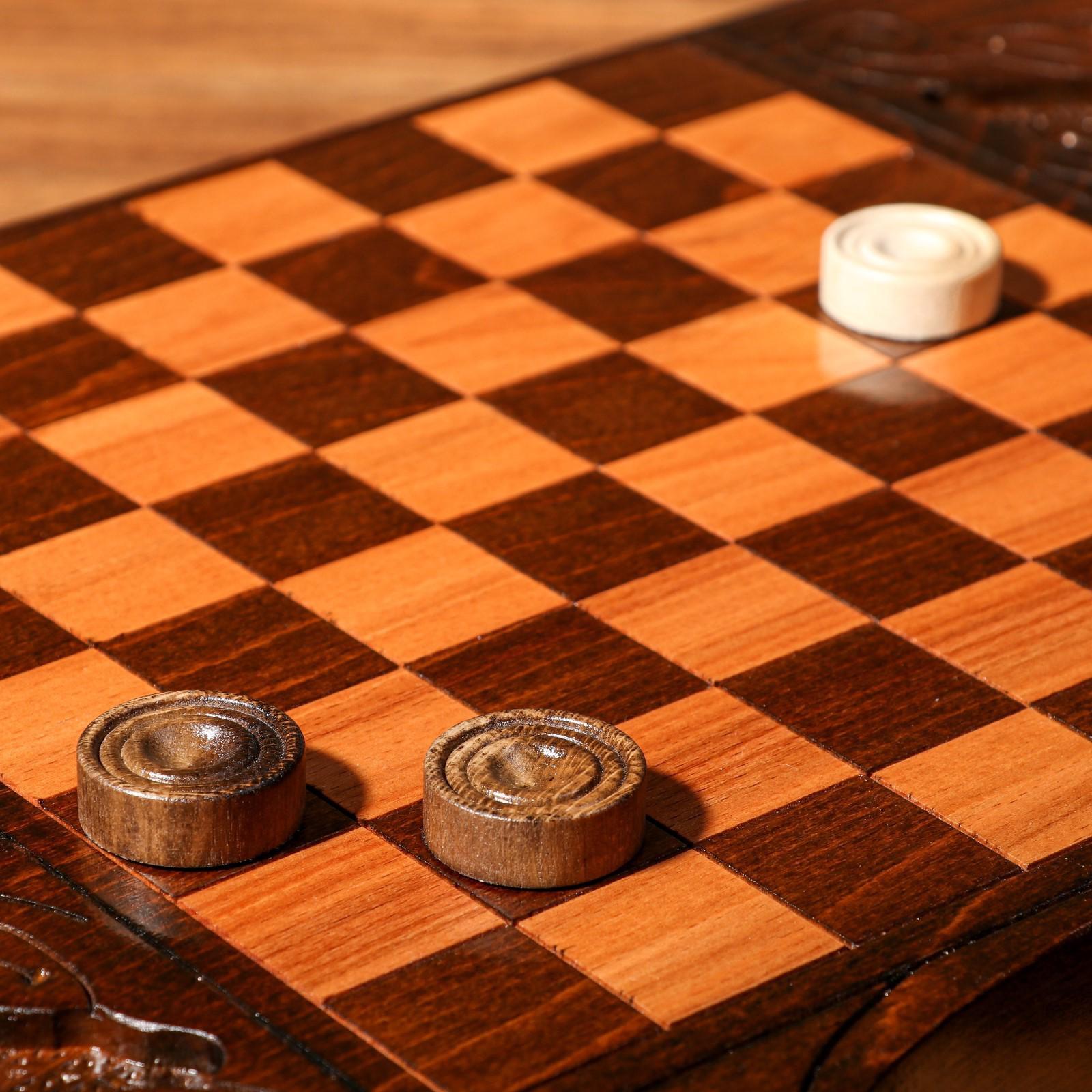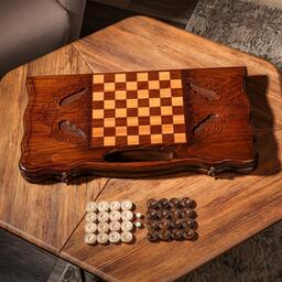 Верхняя внешняя часть доски украшена резным узором. На нижней части доски расположено шахматное поле и обрамлено резным узором. В комплект входят фишки для шашек.