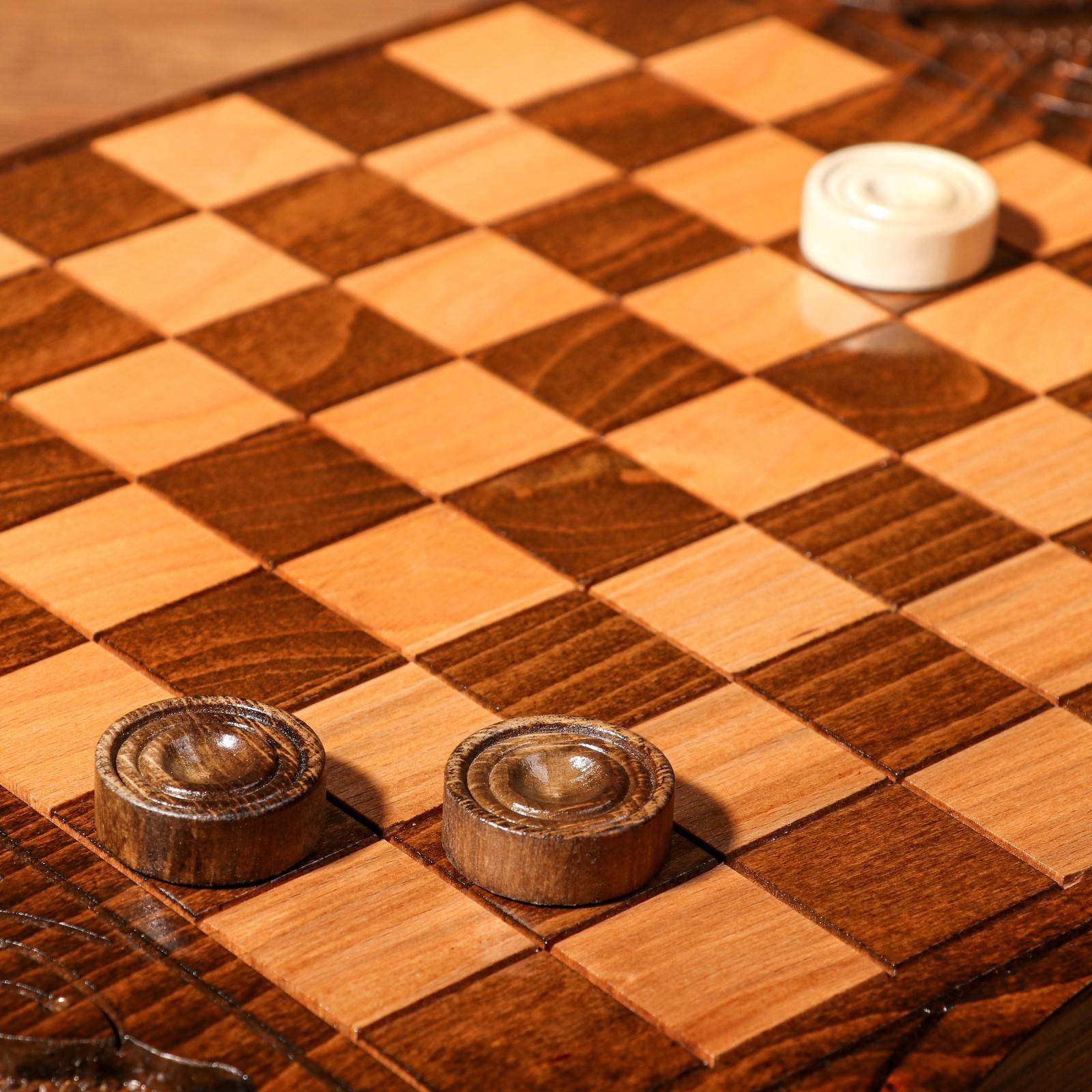 Верхняя внешняя часть доски украшена резным узором. На нижней части доски расположено шахматное поле и обрамлено резным узором. В комплект входят фишки для шашек.