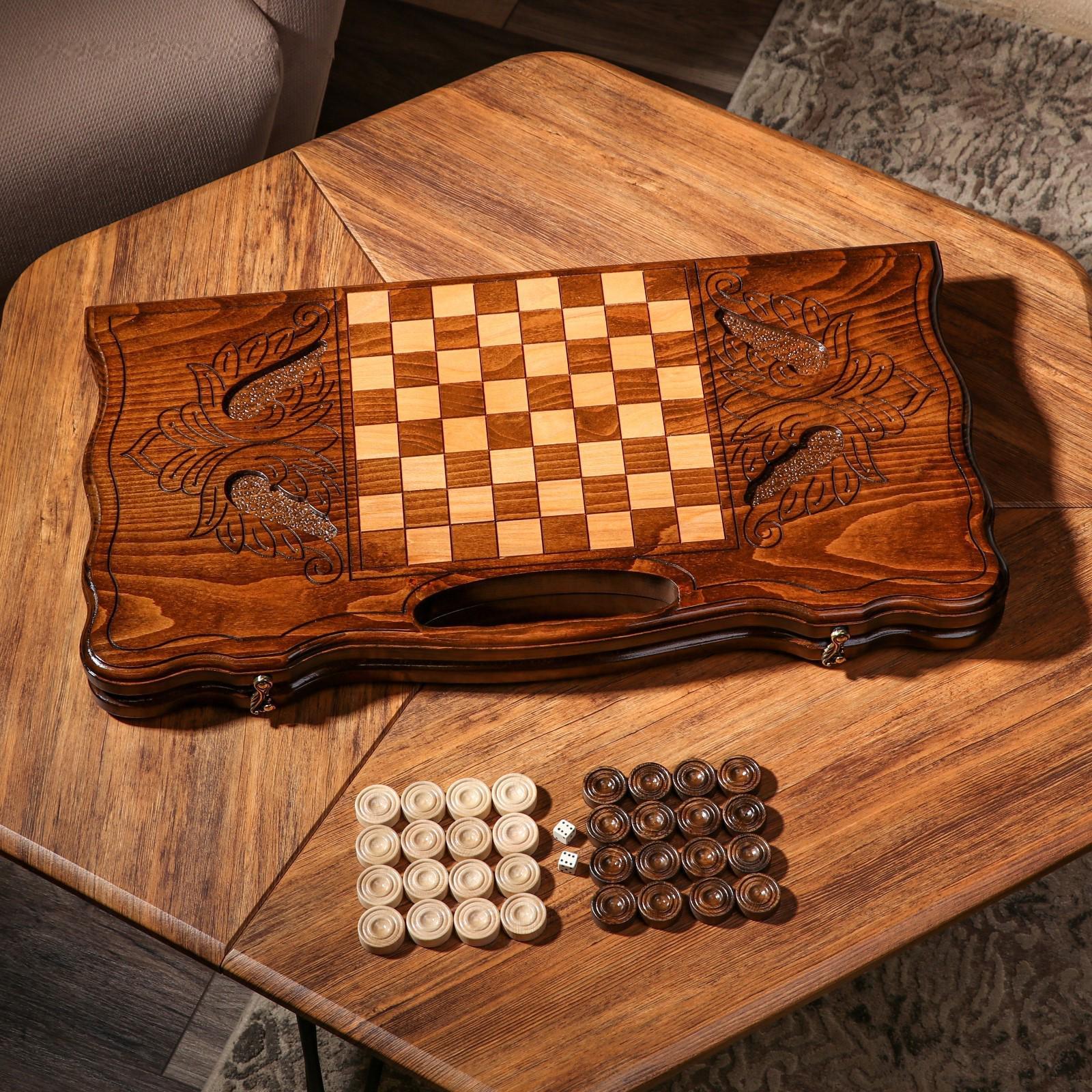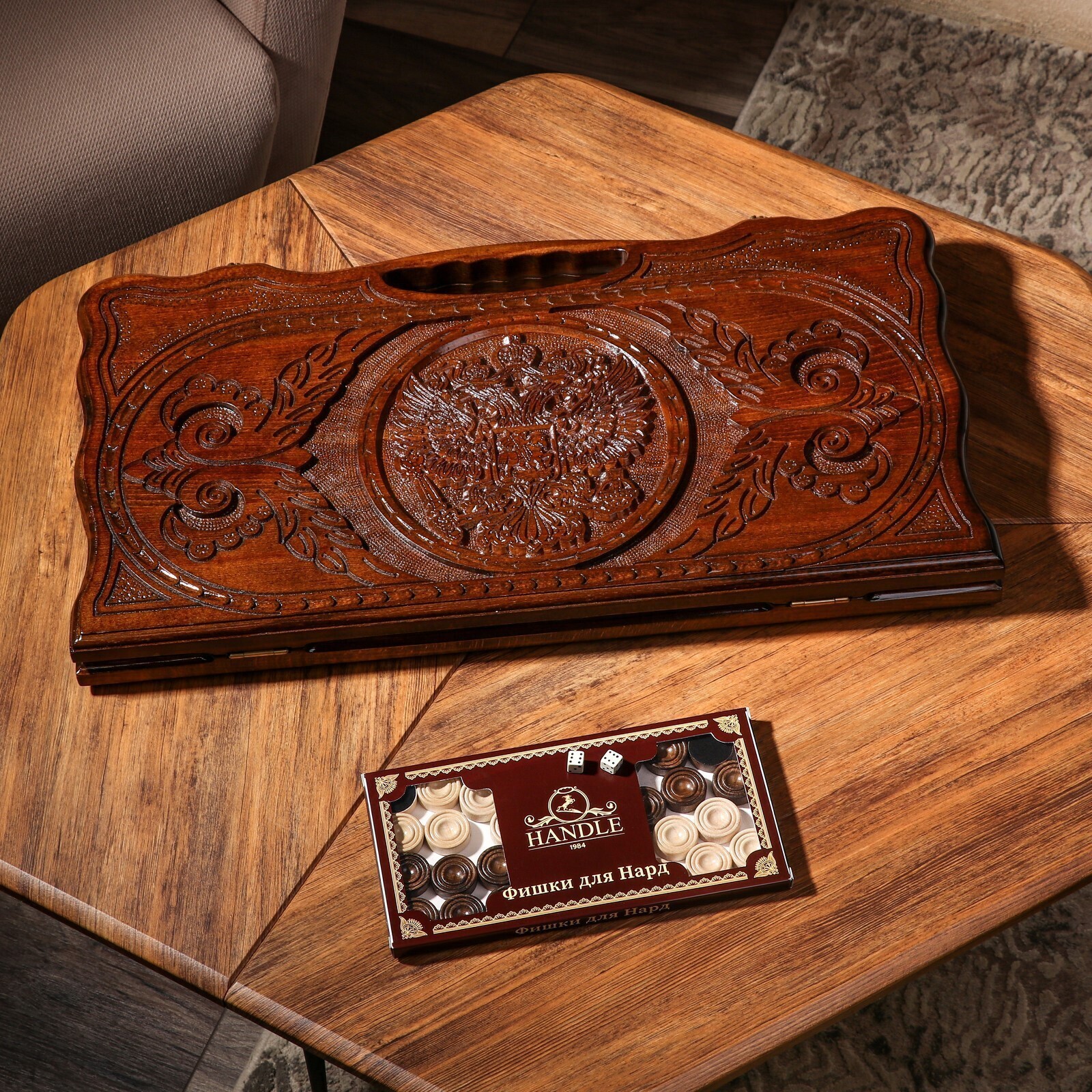 Нарды ручной работы "Герб", глубокая резка, с ручкой, 60х30 см, с шахматным полем, массив ореха, Армения