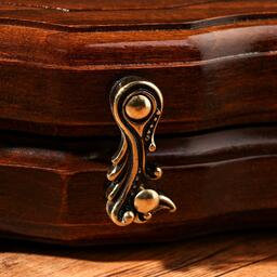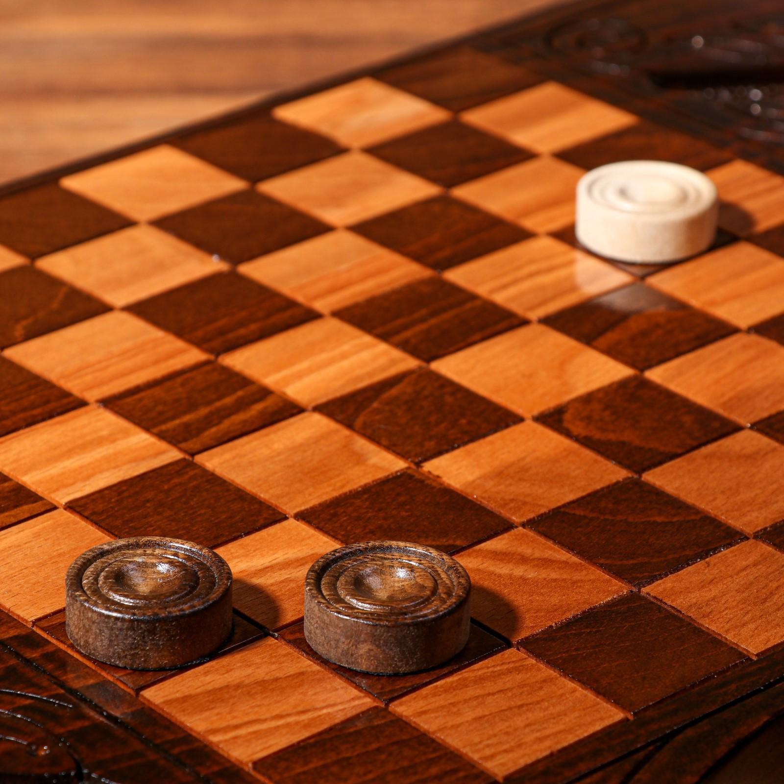 Верхняя внешняя часть доски украшена резным узором. На нижней части доски расположено шахматное поле и обрамлено резным узором. В комплект входят фишки для шашек.