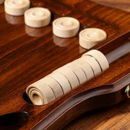 С внутренней стороны доска полностью оформлена под поле для игры в нарды. Фишки вырезаны в ручную, и имеют тканное основание для легкого скольжения по полю.