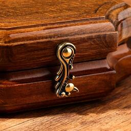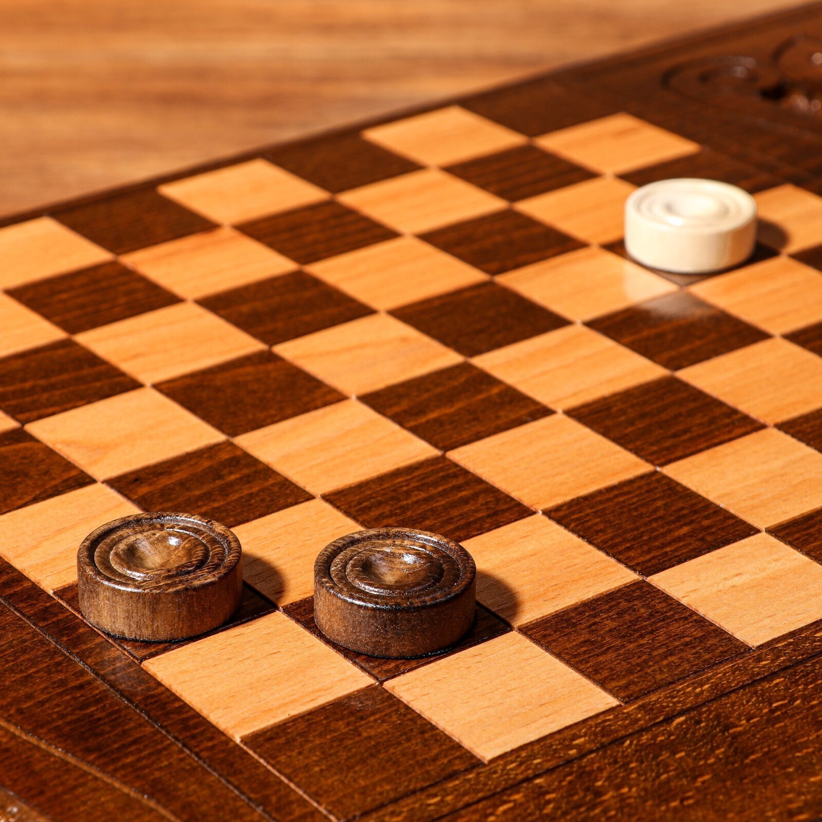 Верхняя внешняя часть доски украшена резным узором. На нижней части доски расположено шахматное поле и обрамлено резным узором. В комплект входят фишки для шашек.
