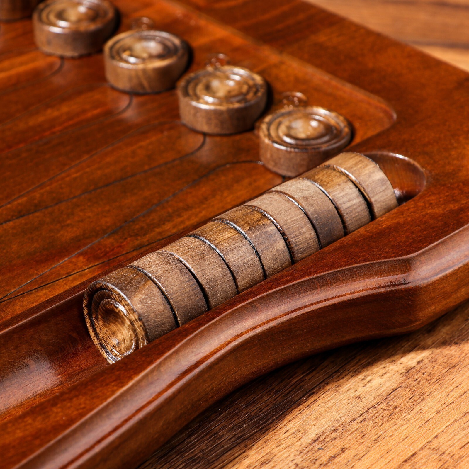 С внутренней стороны доска полностью оформлена под поле для игры в нарды. Фишки вырезаны в ручную, и имеют тканное основание для легкого скольжения по полю.
