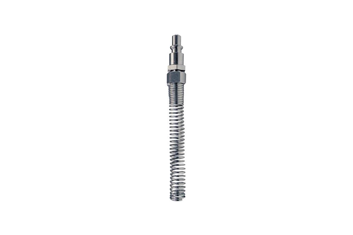 Переходник для подключения компрессора к пневмоинструменту. С одной стороны фитинг рапид папа, с другой - пружина 8x12 мм, которая не позволяет шлангу перегибаться и деформироваться в месте соединения. Поставляется в блистере.